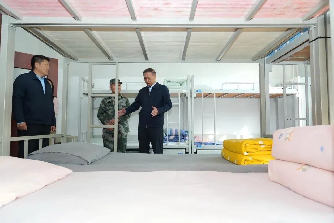 一走进宿舍,蔡大鹏院长就俯身查看内务情况。“内务不是‘形式’,而是培养纪律意识的第一步。” 短短几天的训练,宿舍内,床铺被褥叠放整齐,个人物品摆放井然有序,彰显了军训带来的纪律性与自我管理能力的提升。