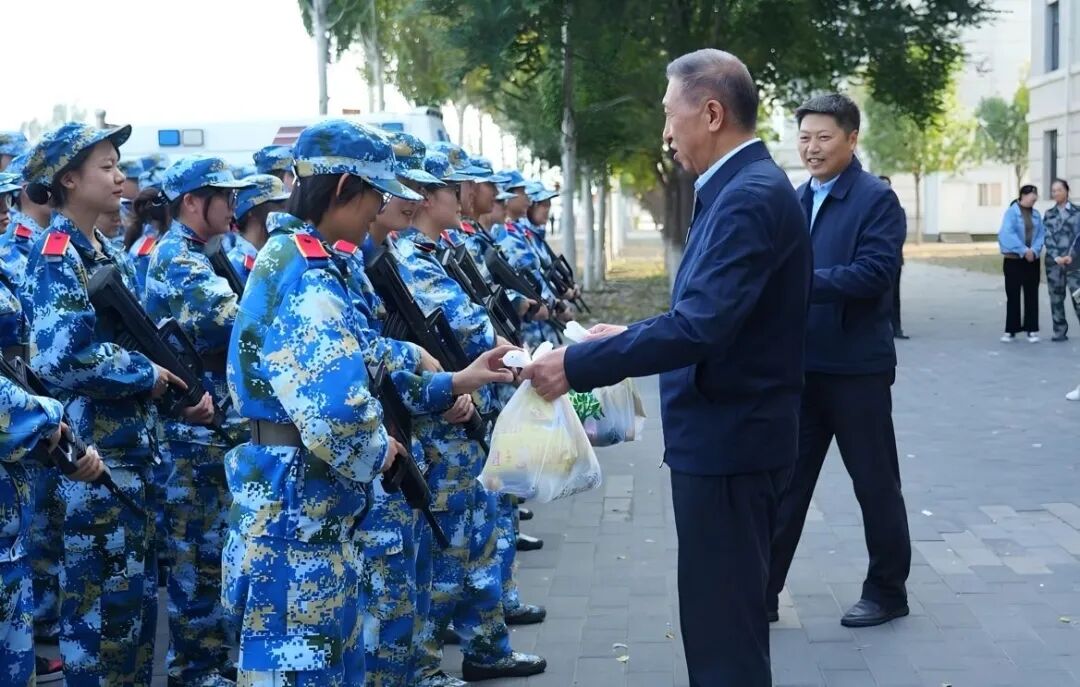 蔡大鹏院长一行来到训练场地。参训学生身着迷彩服,正进行队列、军体拳等科目训练。“同学们辛苦了!训练强度还能适应吗?” 蔡大鹏一行主动走上前关心询问学生,并为各连队送上慰问品。“谢谢院长!我们一定好好训练,不辜负学校的期望!” 接过慰问品,参训学生们齐声回应。