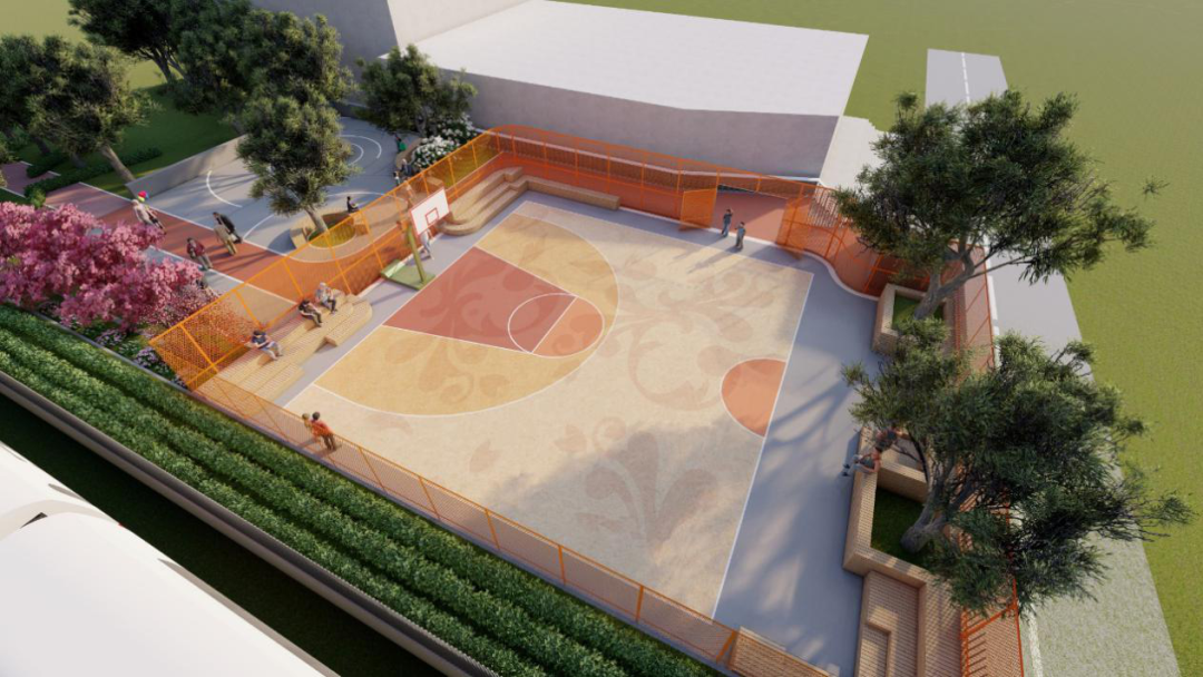 经过公众需求调研,设计团队以儿童为纽带,将不同年龄人群联系到场地中,形成一处安全、多彩的全年龄共享活力空间。设计方案将场地分为综合运动区与休闲活动区,并用一条与北侧带状公园衔接的散步道串联。场地南侧为综合运动区,含标准半场篮球场和适合成人儿童不同坐高的看台,满足运动休息功能。周围设置彩色围网,美观安全,不打扰邻居休息。北侧为低龄儿童与成年居民的休闲活动区,利用树荫与座凳,营造活动交流空间。为体现公众对设计的参与度, 场地内的挡墙与地面通过征集儿童画的形式绘制,施工中组织居民参与,提高居民的认同感。