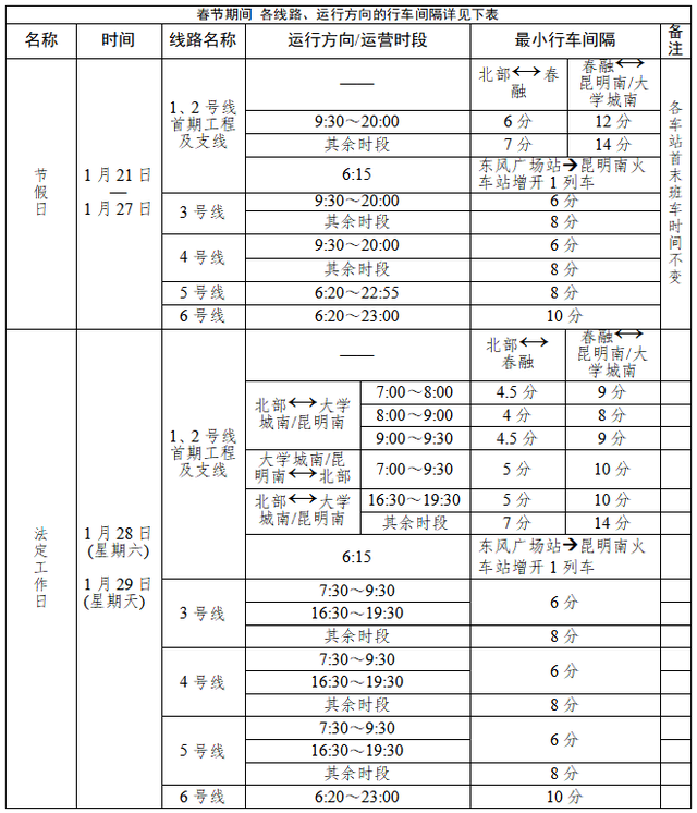 春节期间,各线路、运行方向的行车间隔详见下表: