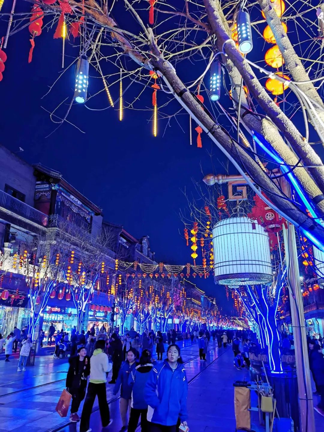 而不远处的步行街内,布置了树挂灯和各色led灯笼,流光溢彩的街景把前门大街装点得分外绚丽,烘托出浓浓的节日气氛。