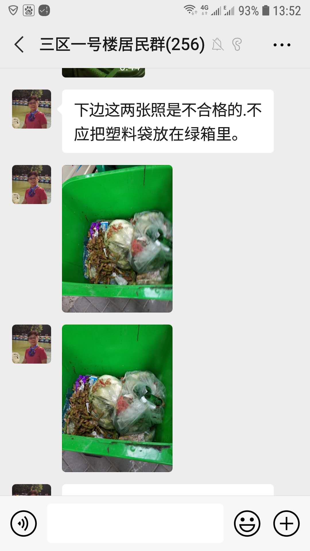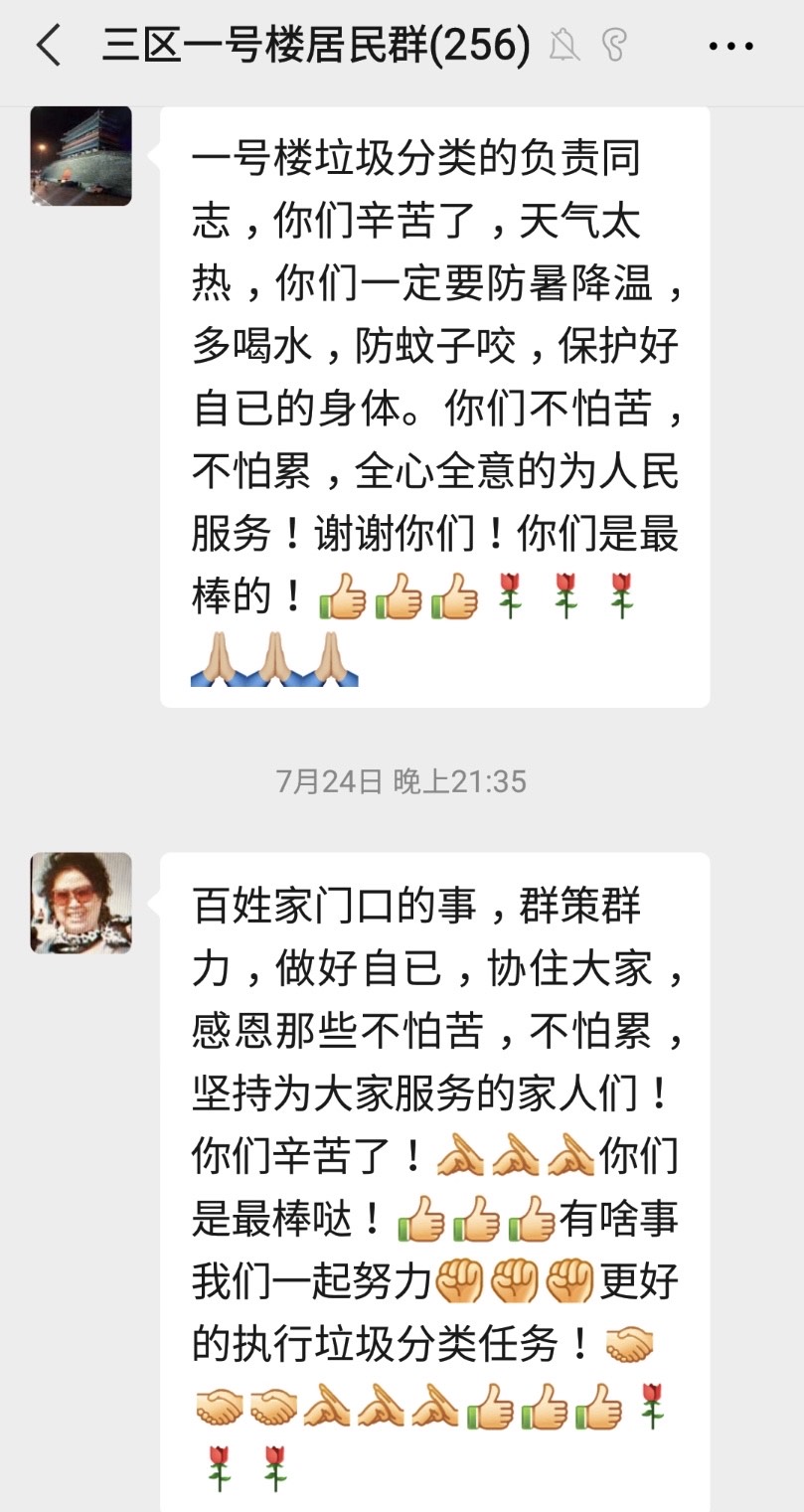 “我们全楼126户居民都在这个微信群里,我把每天情况发到群里,很多居民留言、点赞,对于混投等不文明的行为,我也会通过视频曝光,起到提醒和教育的效果。现在大部分居民都能做到分类投放,不分类或是乱投的情况越来越少。”
