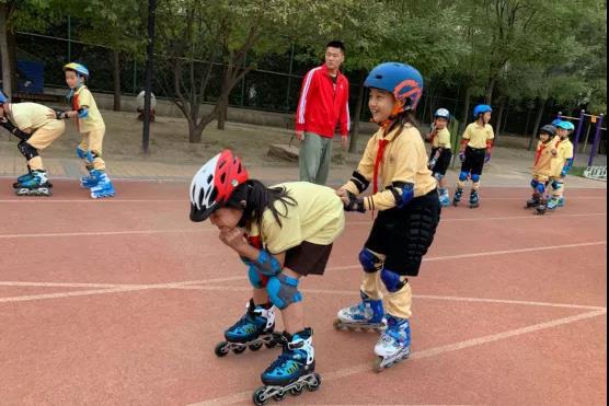 北京第二实验小学朝阳学校的学生们脚踩轮滑鞋练习基础动作,一、二、三,走起~