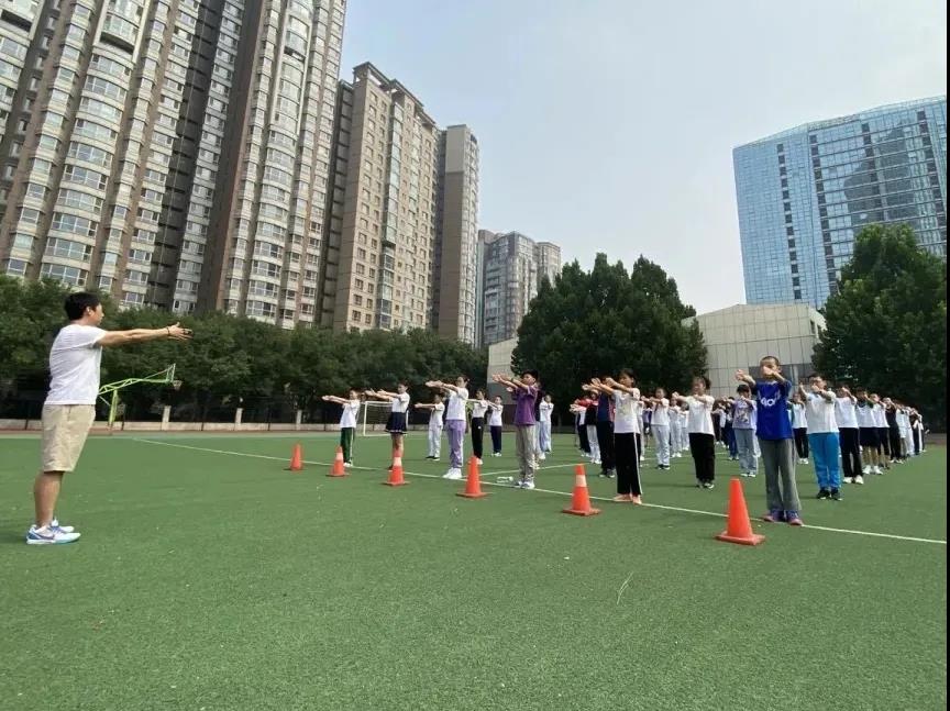 北京市日坛中学实验学校的学生们在操场上摩拳擦掌、跃跃欲试,做着运动前的热身准备。
