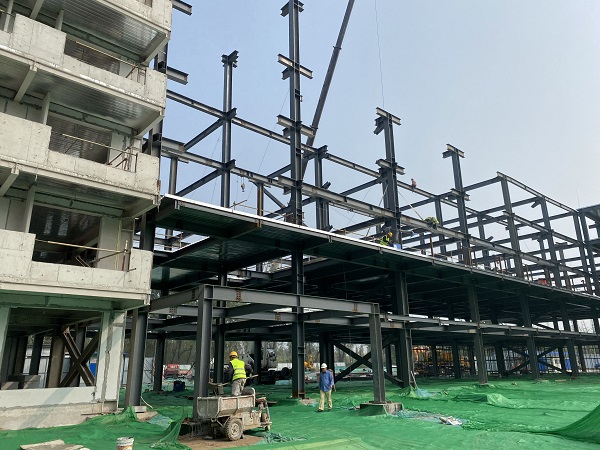 混凝土浇筑屋顶、钢结构吊装、安装电梯井防护栏……记者在现场看到,土建、钢筋、电气焊等7个工种、120余名工人在各自岗位忙活着。