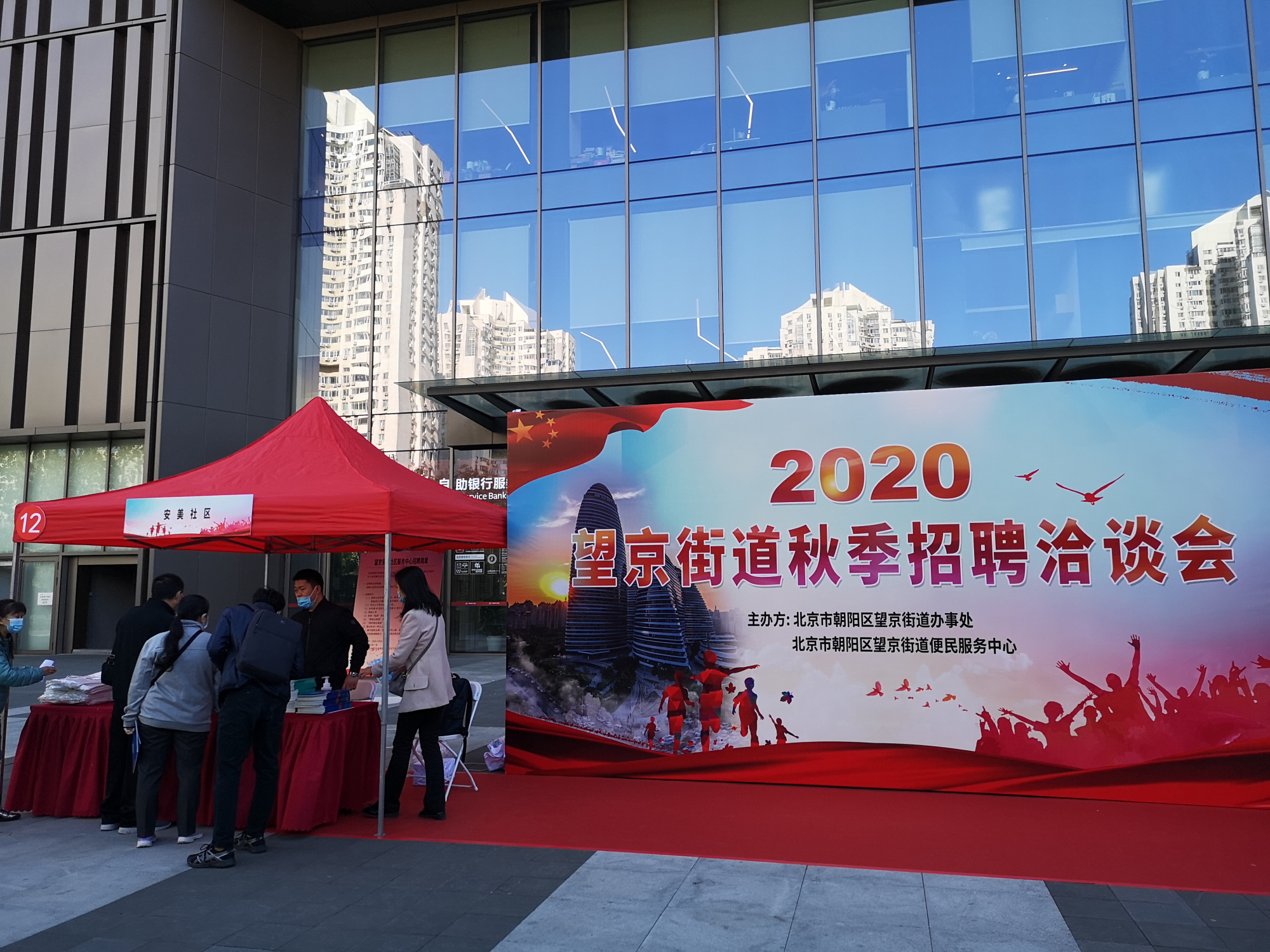 10月13日,望京街道在首开广场举办“2020年望京街道秋季招聘洽谈会”。此次活动共有辖区21家企业参与,涉及物业、餐饮、商超、科技等多个行业,提供办公室文员、服务员、文案策划、人力资源专员等200余个岗位。参会企业在现场摆出展板,列出所需的岗位和应聘条件,吸引众多求职者驻足观看询问。