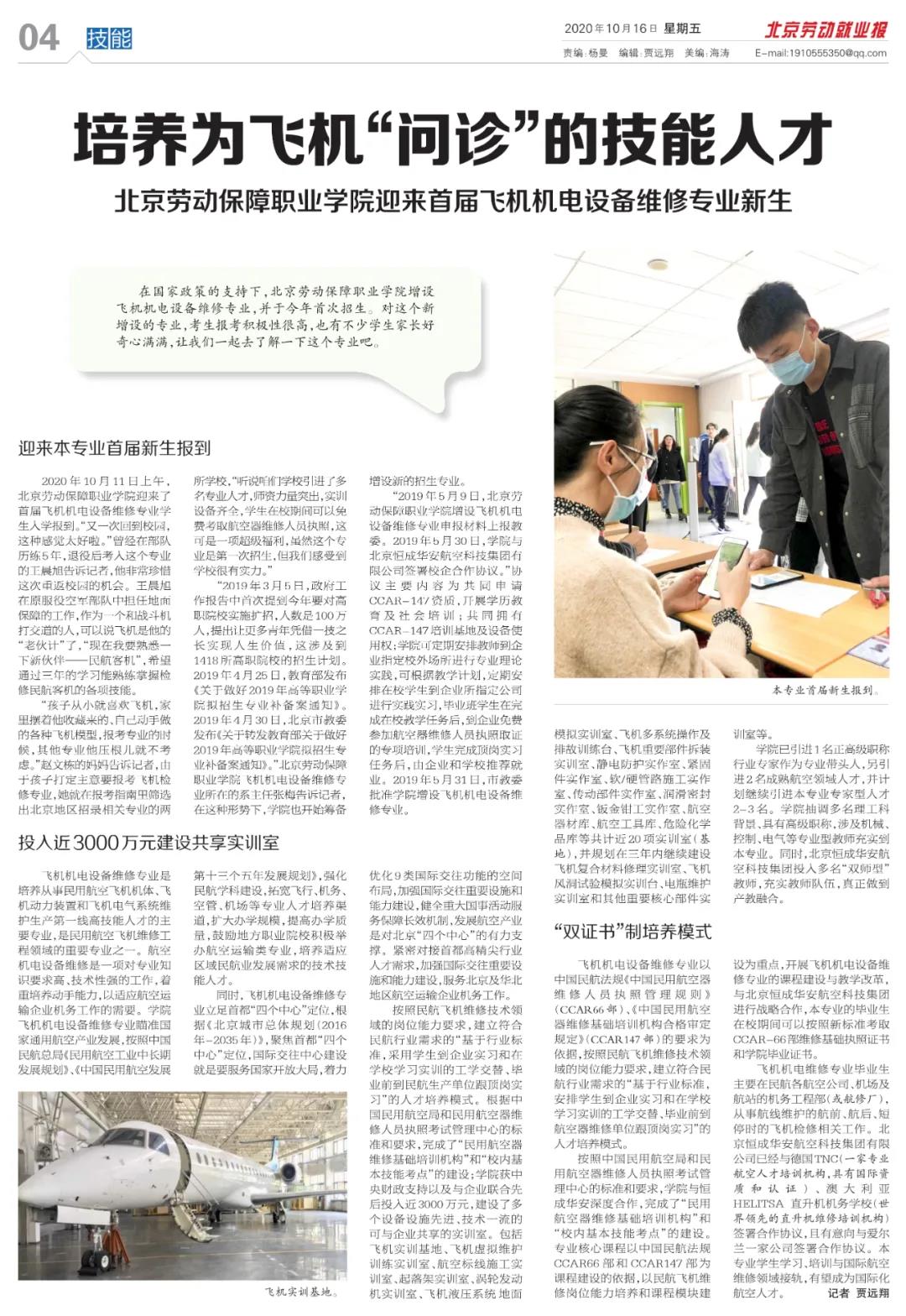在国家政策的支持下,北京劳动保障职业学院增设飞机机电设备维修专业,并于今年首次招生。10月11日上午,劳职院迎来了首届飞机机电设备维修专业学生入学报到。对此,《北京劳动就业报》进行了专题报道。