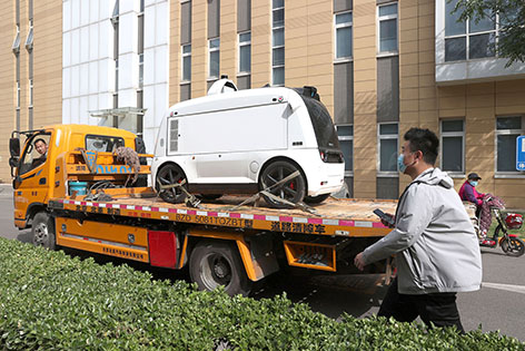 5月25日7时,一辆完成涂装的无人售卖车在工作人员的遥控下“走”上货车,准备正式“上岗”。