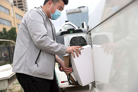 5月25日8时20分,工作人员在给无人售卖车上货。这台无人售卖车的肚子里装的全是冰淇淋。