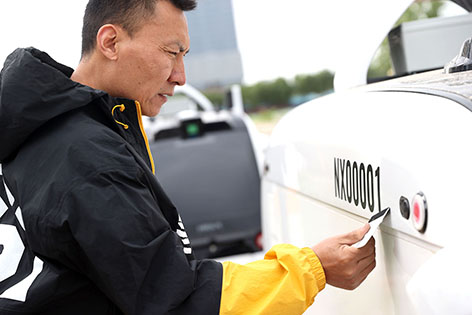 5月24日16时,工作人员给即将投入使用的无人售卖车试贴车辆编码,为上路做准备。