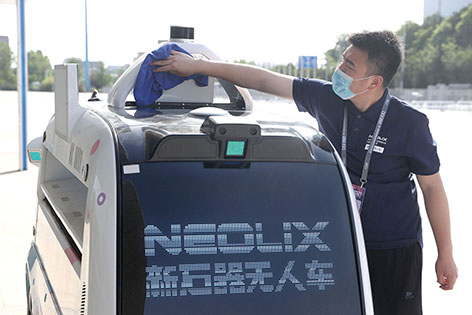 5月25日7时30分,即将“上岗”的无人售卖车接受工作人员的“搓澡”服务。