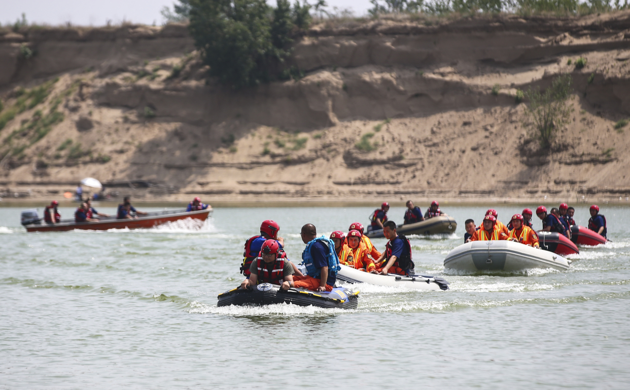今天,在永定河内一处宽阔的水面上,多艘冲锋舟正以网格化编队在区域内搜索落水车辆……这不是真的在救援,而是大兴区开展的“平安大兴”2021综合水域演练。