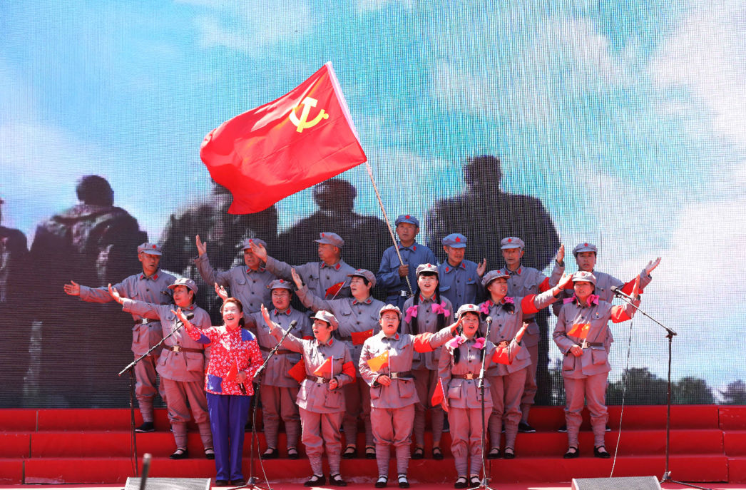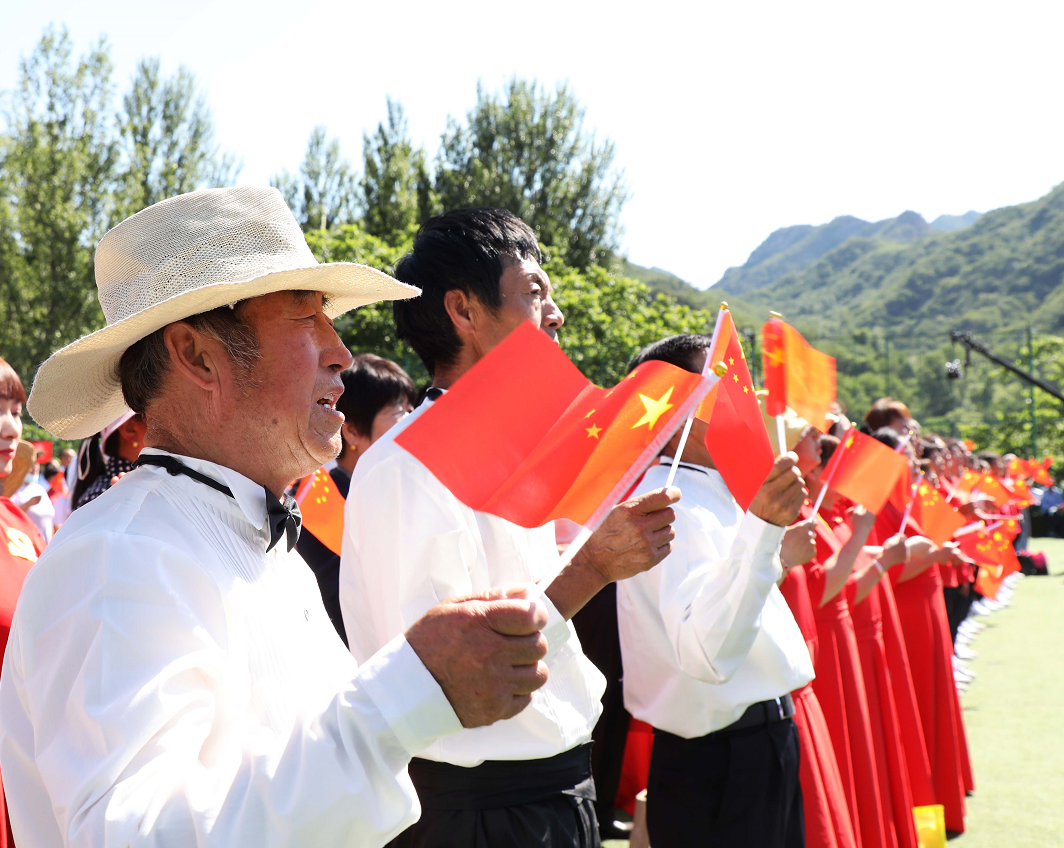 高亢的歌声伴随掌声和欢呼声在山谷中回荡,全体演职人员挥动手旗汇成了一片红色海洋。