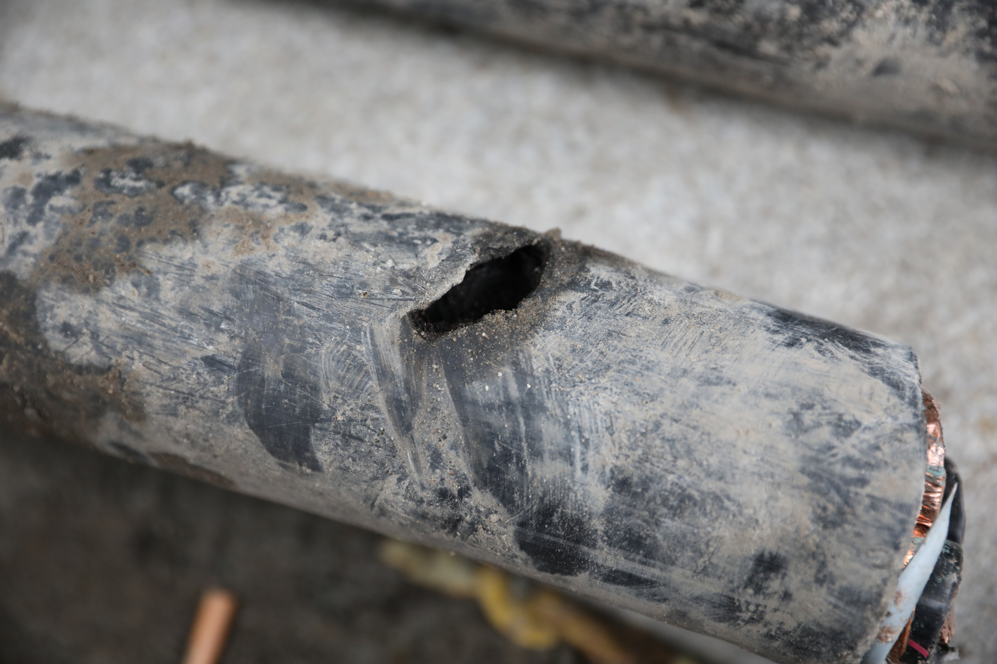根据电力部门现场对故障电缆进行放电确认,此次瞬时停电事故故障点就是钻孔冒黑烟的施工点位。通过挖掘清理,电缆外护套可明显见到被电镐损坏形成的不规则破口,周边烧蚀痕迹为电缆遭破坏时线芯对钻头放弧所产生。电力部门对故障电缆进行修复并加套钢管对该酒店门前电缆进行防护,由于施工区域较窄且过往行人多,当天只能全部进行人工开挖和修复工作,于当天20时前完成了抢修工作。