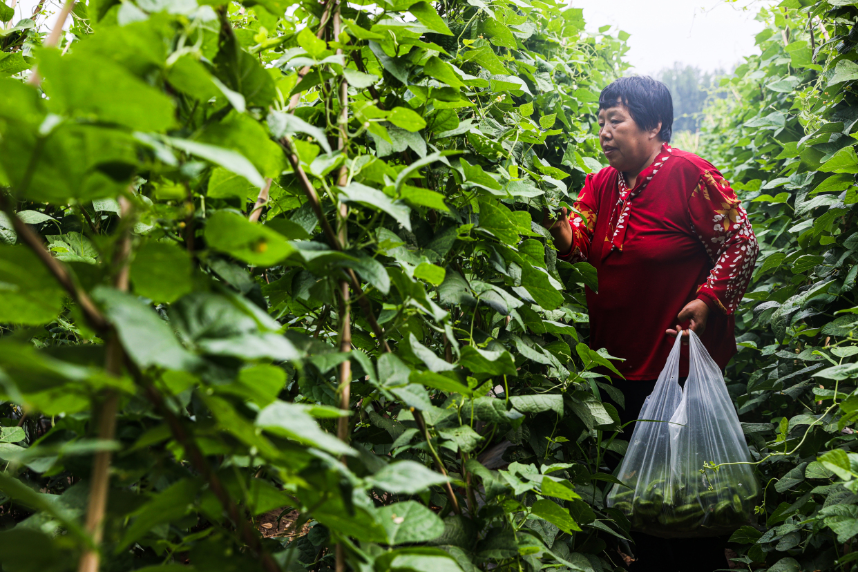 记者在长子营镇小黑垡村的共享菜园看到,这里种植的蔬菜都是选择适合当地居民食用,能够进行采摘且产量较高的品种,主要有黄瓜、豆角、茄子、番茄、菜椒、尖椒、小串铃冬瓜、大葱、香菜等。村民们自己种植,等到蔬果成熟后,可自由采摘。