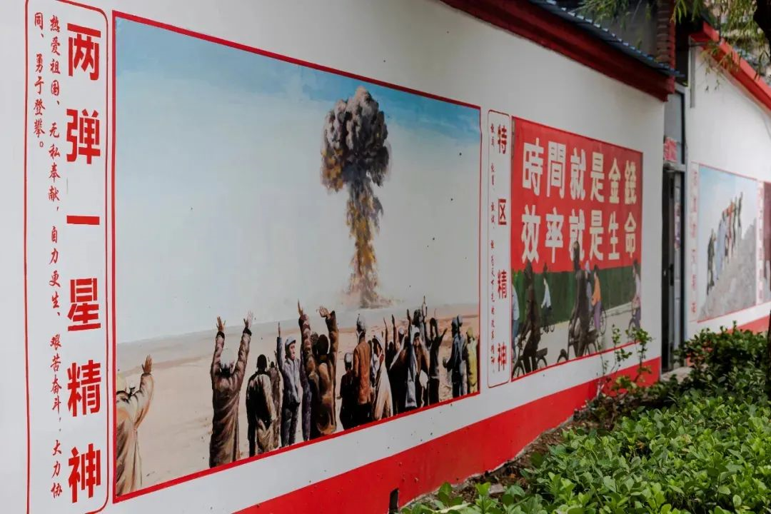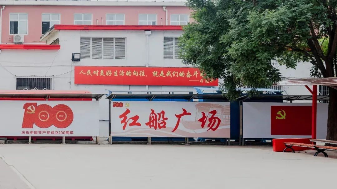 从社区入口处进入党史大道一直向前走,100米的距离代表了党的百年发展历程,人们一路看一路思考,好像通过党史大道“穿越”进了那些历史,又好像在与那些伟大的党史人物对话,顺着这条康“庄”大道,一艘红船“驶”进了社区,“红船广场”四个大字映入眼帘。
