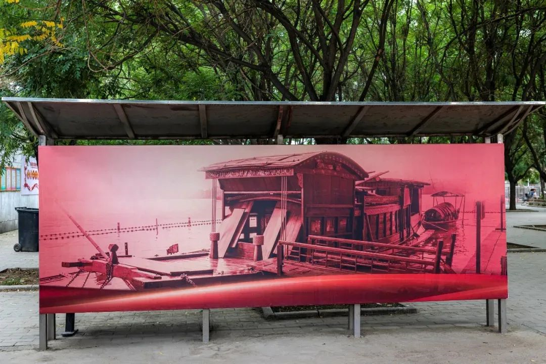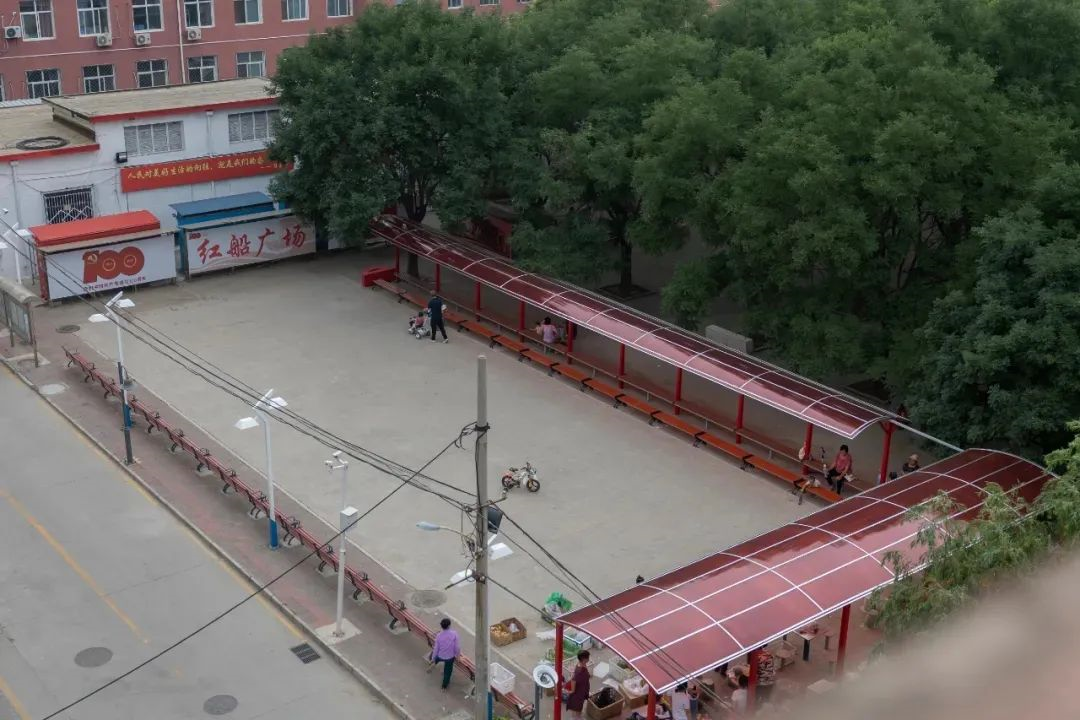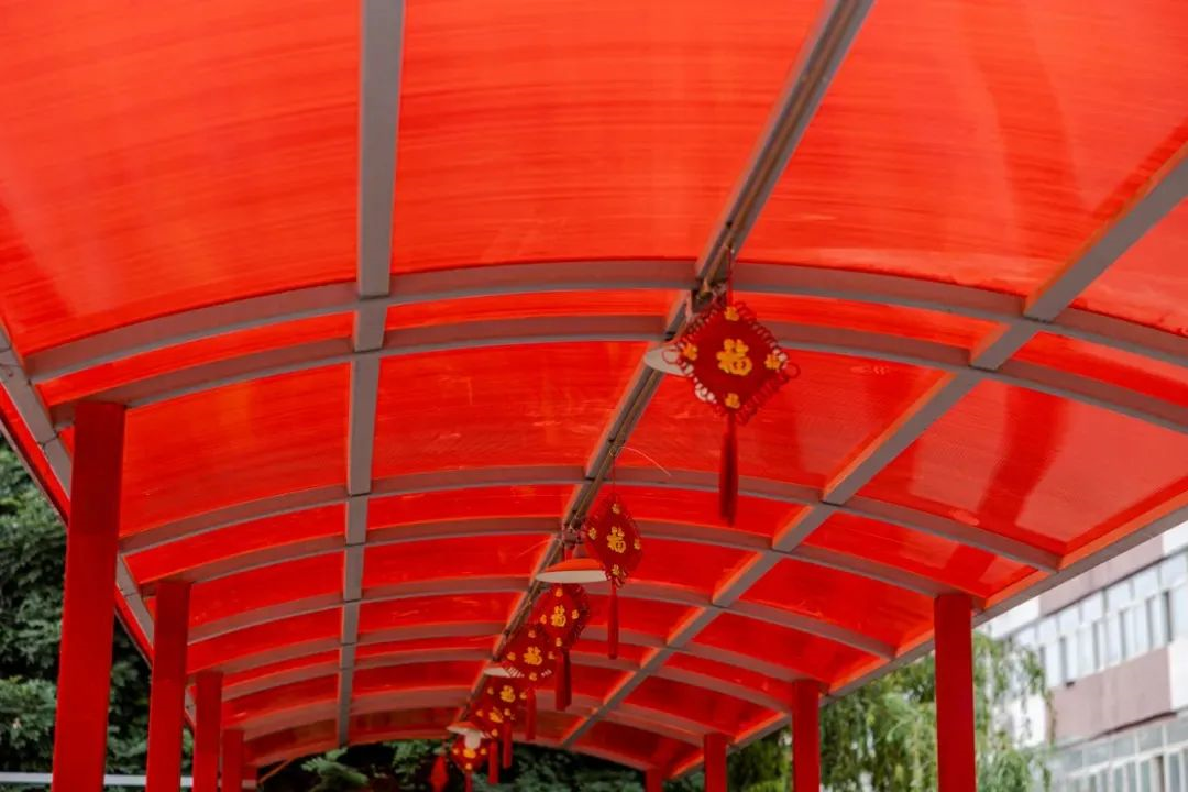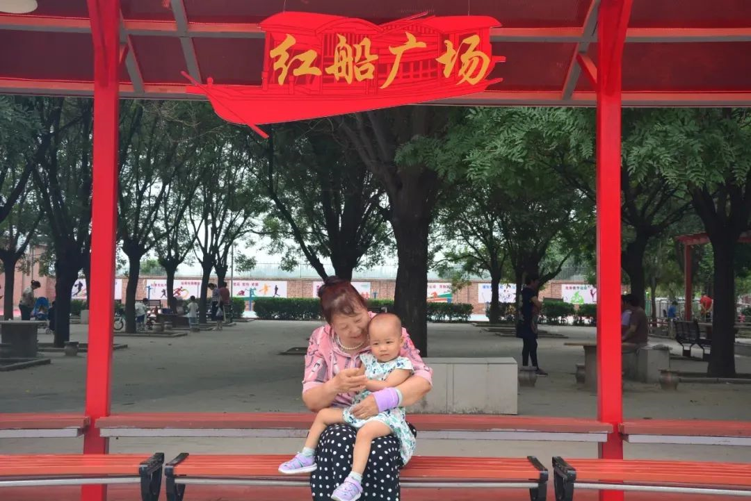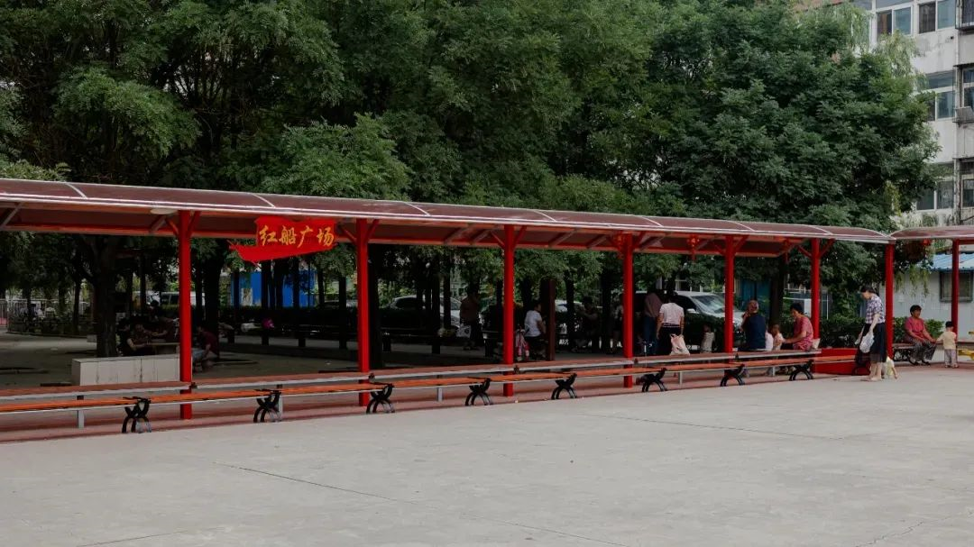 这艘“红船”面积约270㎡,红色的座椅环绕四周装饰成“船身”,南侧的“船头”处赫然写着“庆祝中国共产党成立100周年”,北侧的“船尾”处是一条休闲长廊,长廊里吊着的中国结上的“福”字下面,居民们正在聊天乘凉。