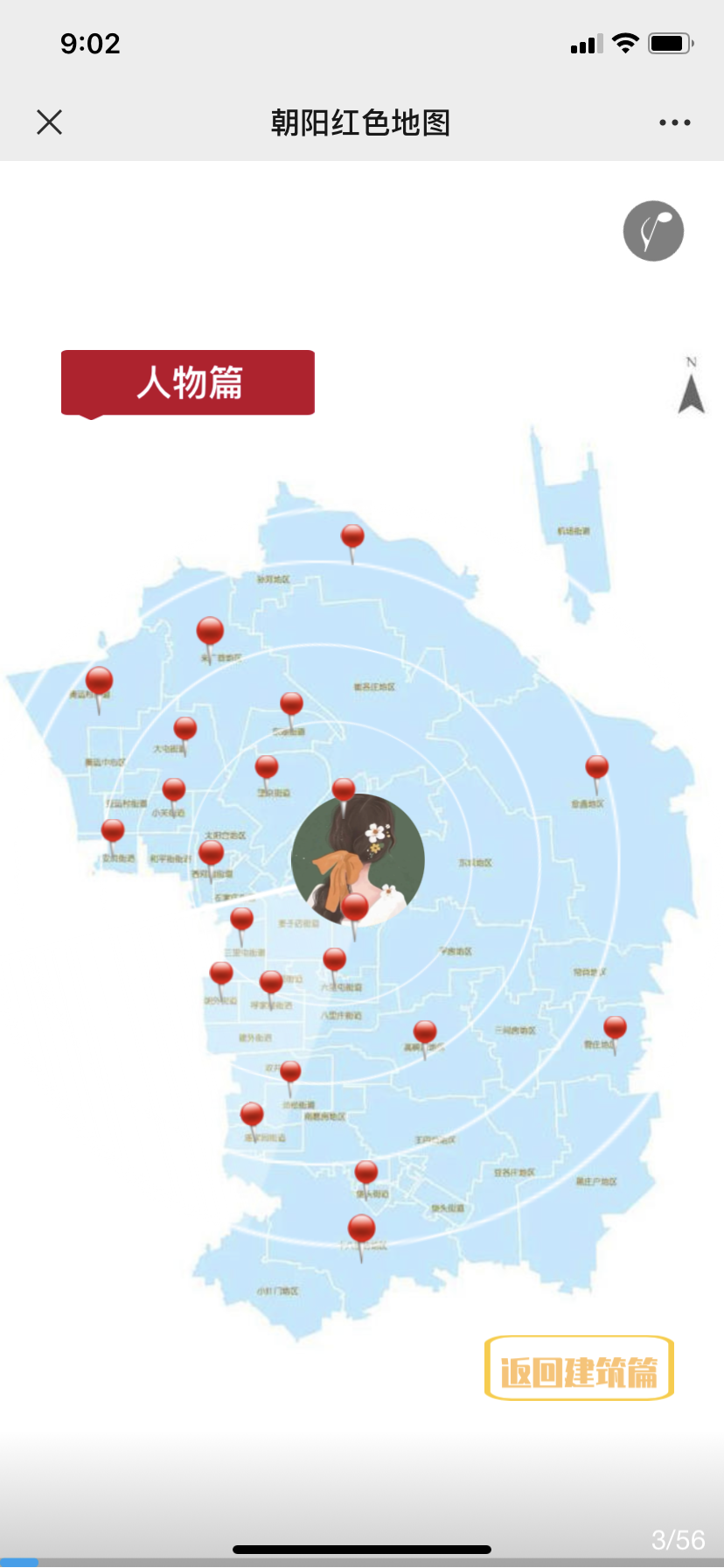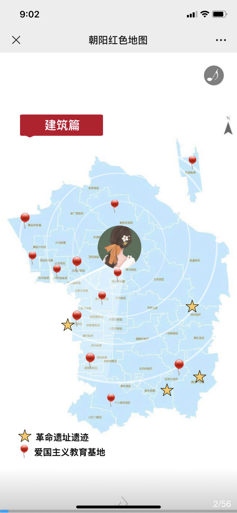 “朝阳红色地图”分为“建筑篇”和“人物篇”两个板块,地图上包含54处点位,分别用五角星和坐标点标注“革命遗址遗迹”和“爱国主义教育基地”以及人物所在地,每点击一处五角星或坐标点,便可展示该区域红色建筑或优秀党员的图文漫画,了解他们的故事。