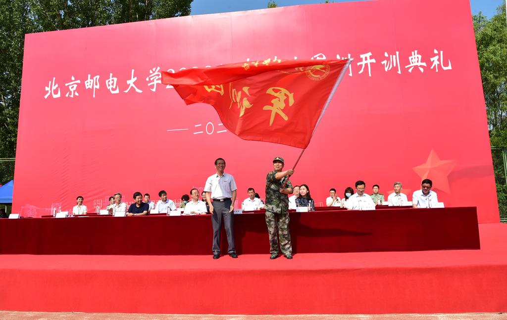 开训典礼在参加过庆祝中国共产党成立100周年大会广场合唱演出的参训学员代表们嘹亮的歌声中拉开帷幕。武装部部长王建坤宣读了《关于成立北京邮电大学2020级本科生军训团的决定》并向军训团授予团旗。