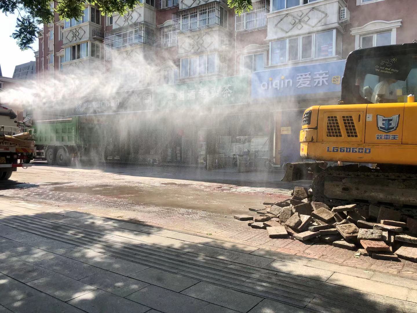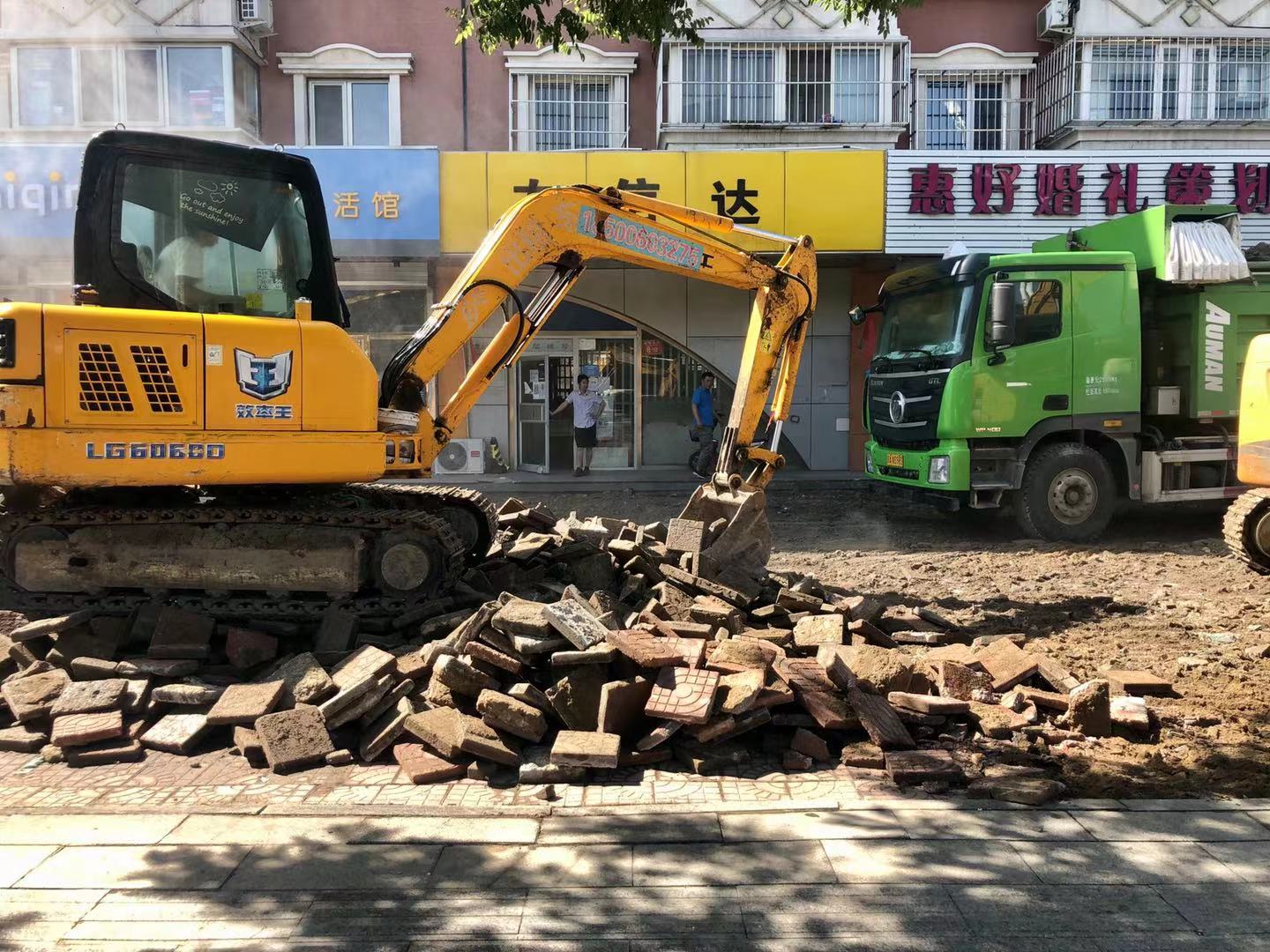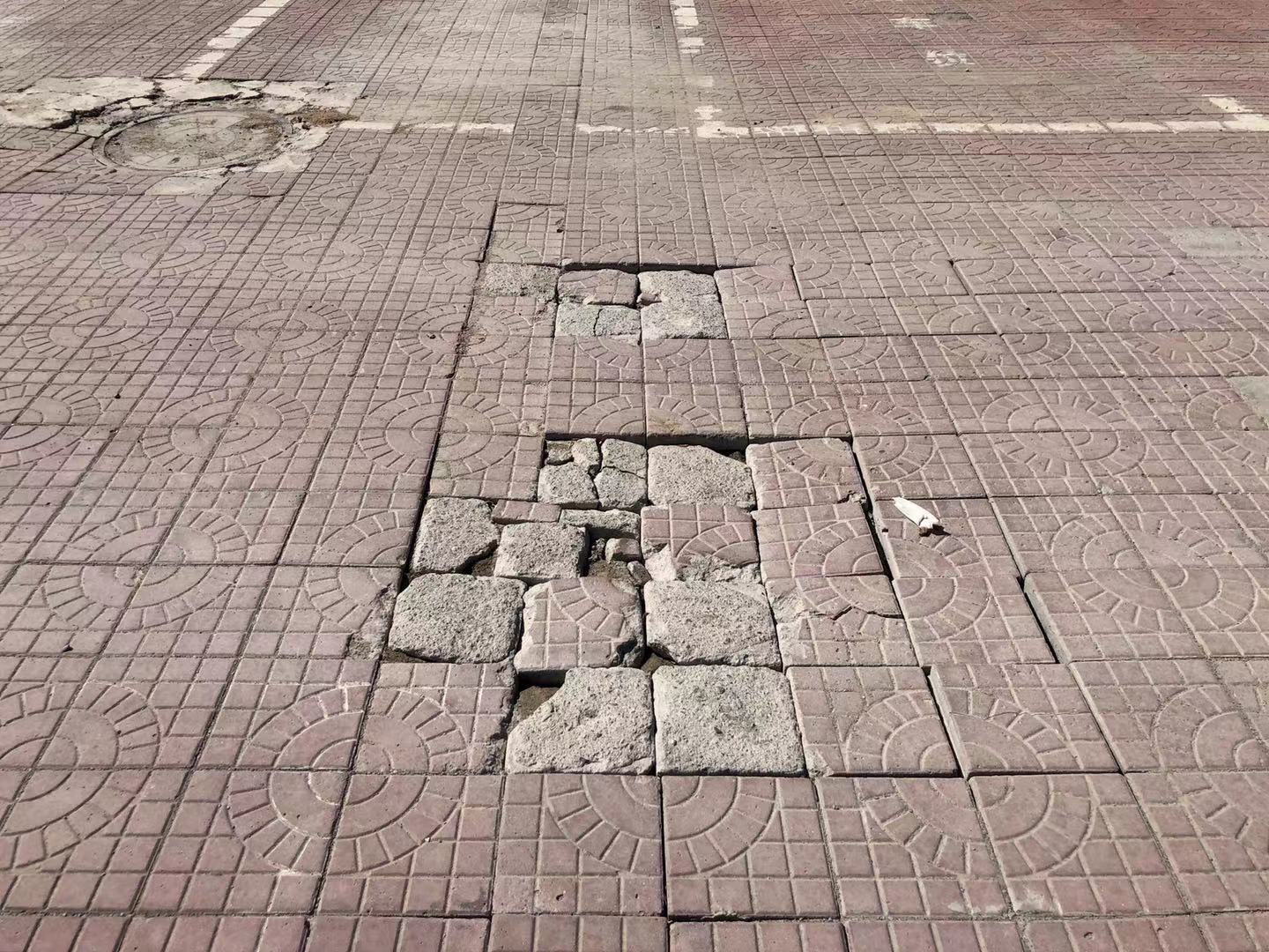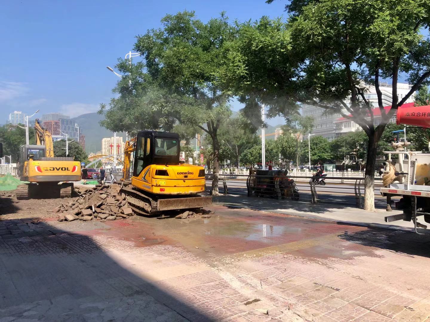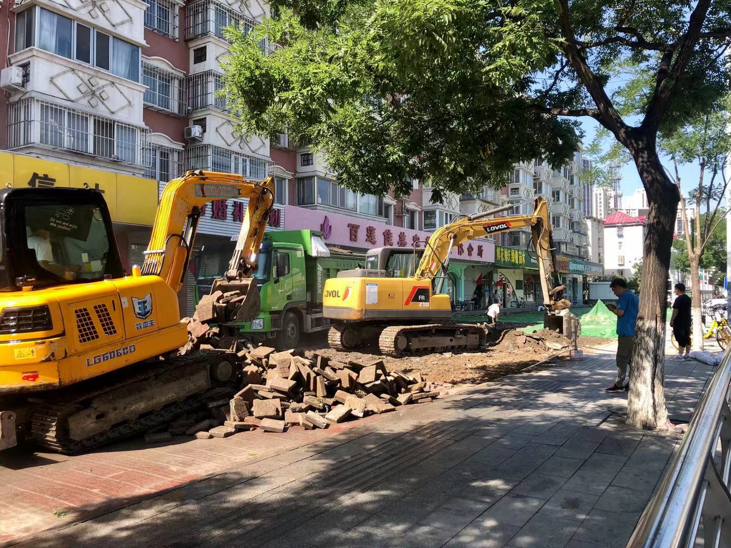 在绿岛家园大门口处,两台挖掘机正在清除路面上已破损的步道砖,被清理完成的裸露地面已被滤网覆盖,现场还有洒水车喷雾降尘。记者在还未动工的地段看到,路面破损凹陷的情况非常严重,车辆行驶过这里会很颠簸,行人也对这种路况非常不满意。
