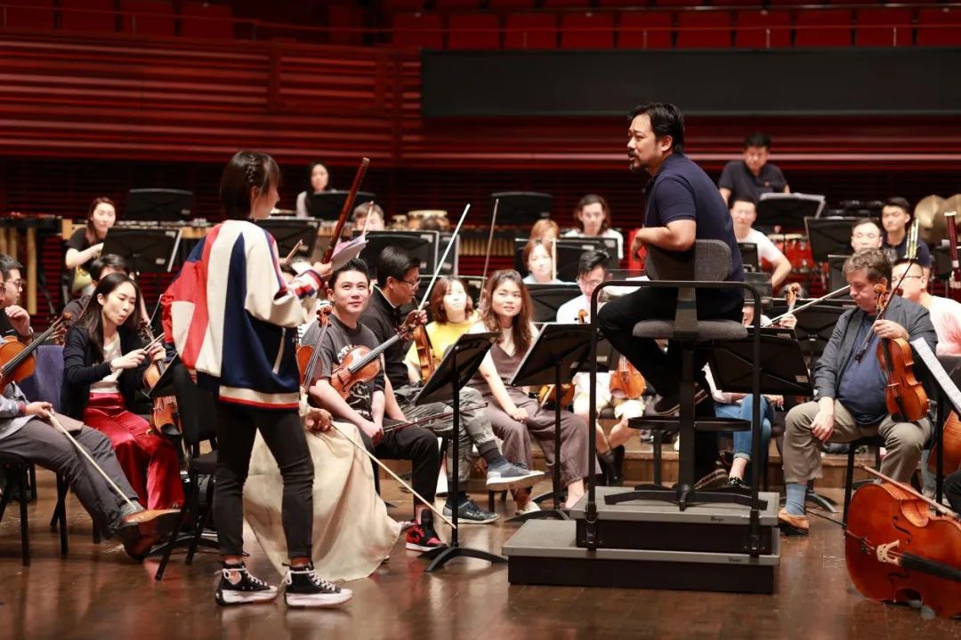 竹笛表演专业学生陈泓璇与乐队现场排练《中国随想曲No.1——东方印象》,指挥林大叶与她沟通排演技巧
