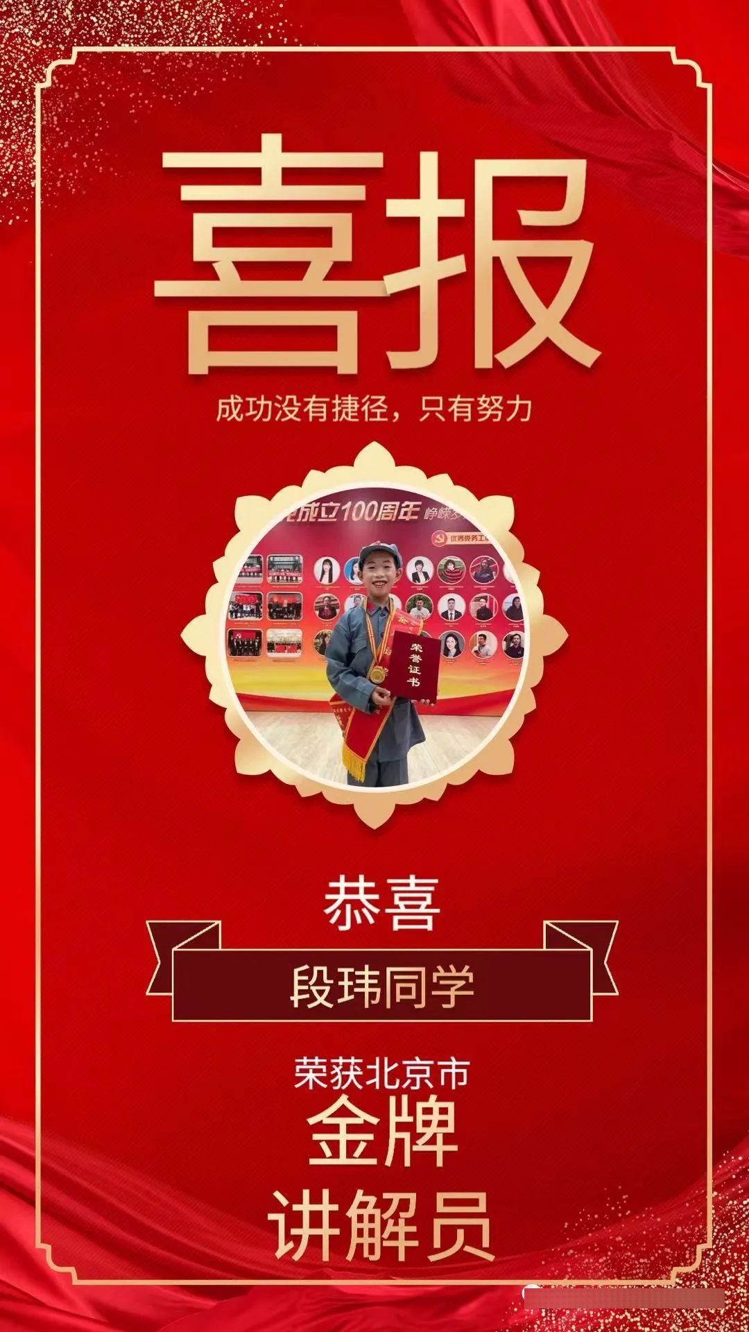 7月11日,平北抗日战争纪念馆,小小讲解员段玮同学代表延庆出征,参加北京市红色故事讲解员大赛(中小学生组),荣获北京市“金牌讲解员”称号。
