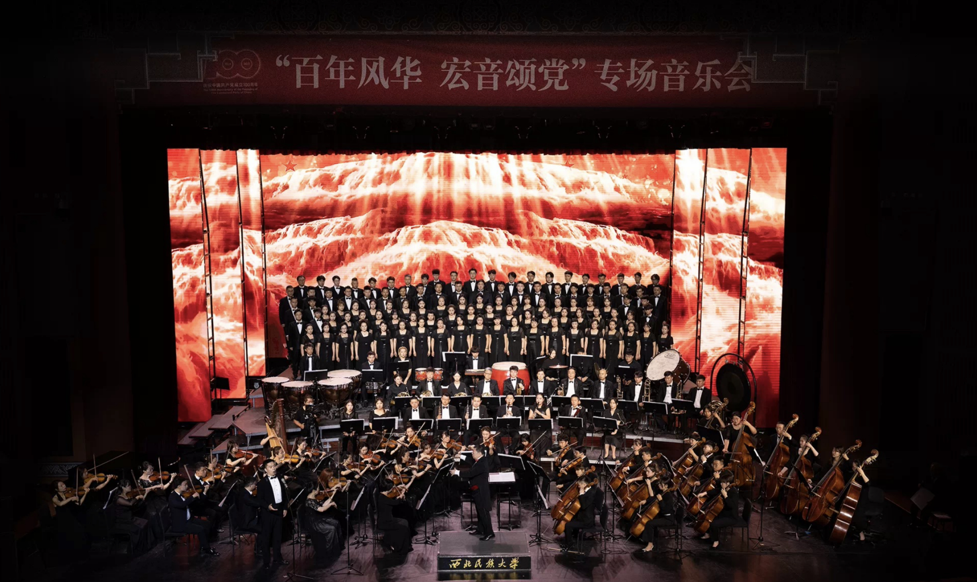 研讨会期间,与会专家学者与近千名师生共同观看了西北民大“百年风华 宏音颂党”专场音乐会。音乐会特邀中国音乐家协会合唱联盟副主席曹丁、北京青年交响乐团常任指挥韩多多担任指挥,与该校音乐学院交响乐团、管乐团、合唱团百余名师生联袂带来《黄河大合唱》的红色旋律,用音乐党课的形式铭记初心、向党致敬。