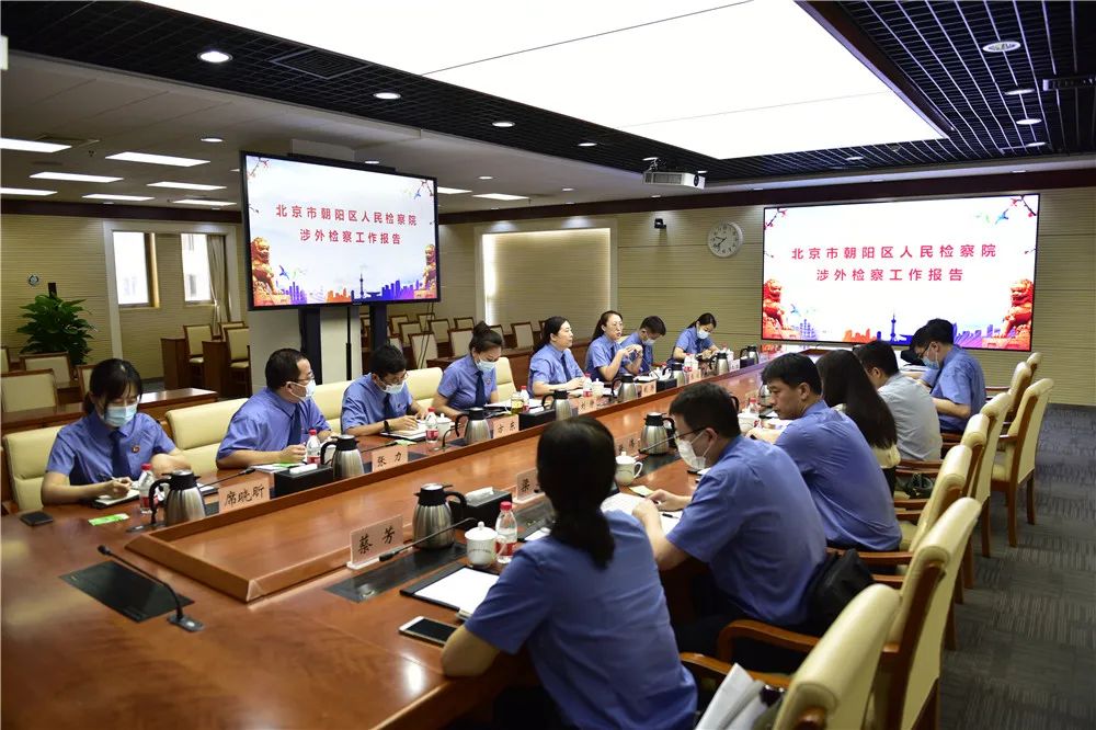 第一检察部主任张欣汇报了朝阳区检察院专业化涉外办案组织建设的历史沿革和现有办案组织情况。涉外案件办案组的检察官汇报了在统一业务应用系统上办理涉外案件的实际操作情况。