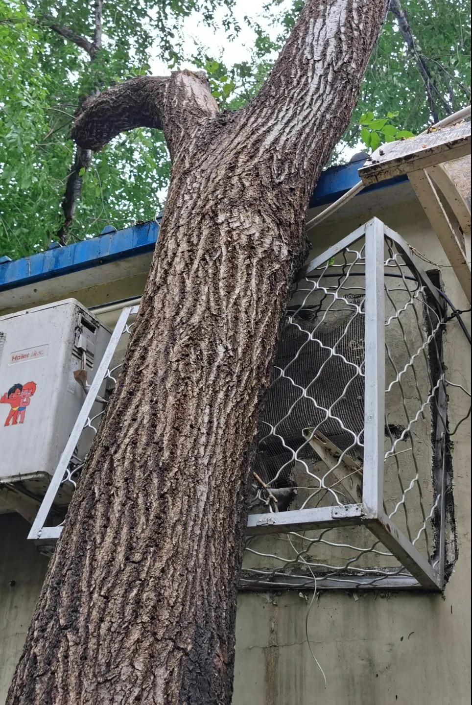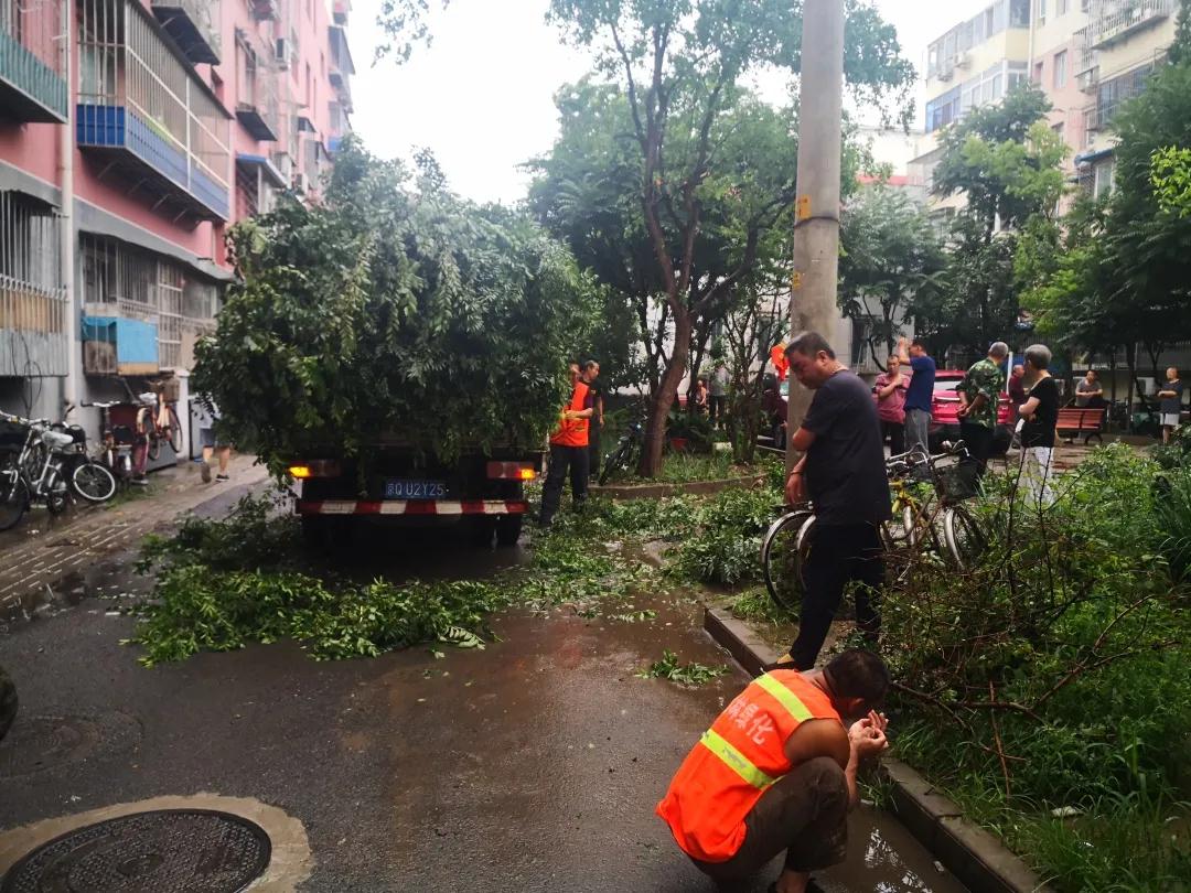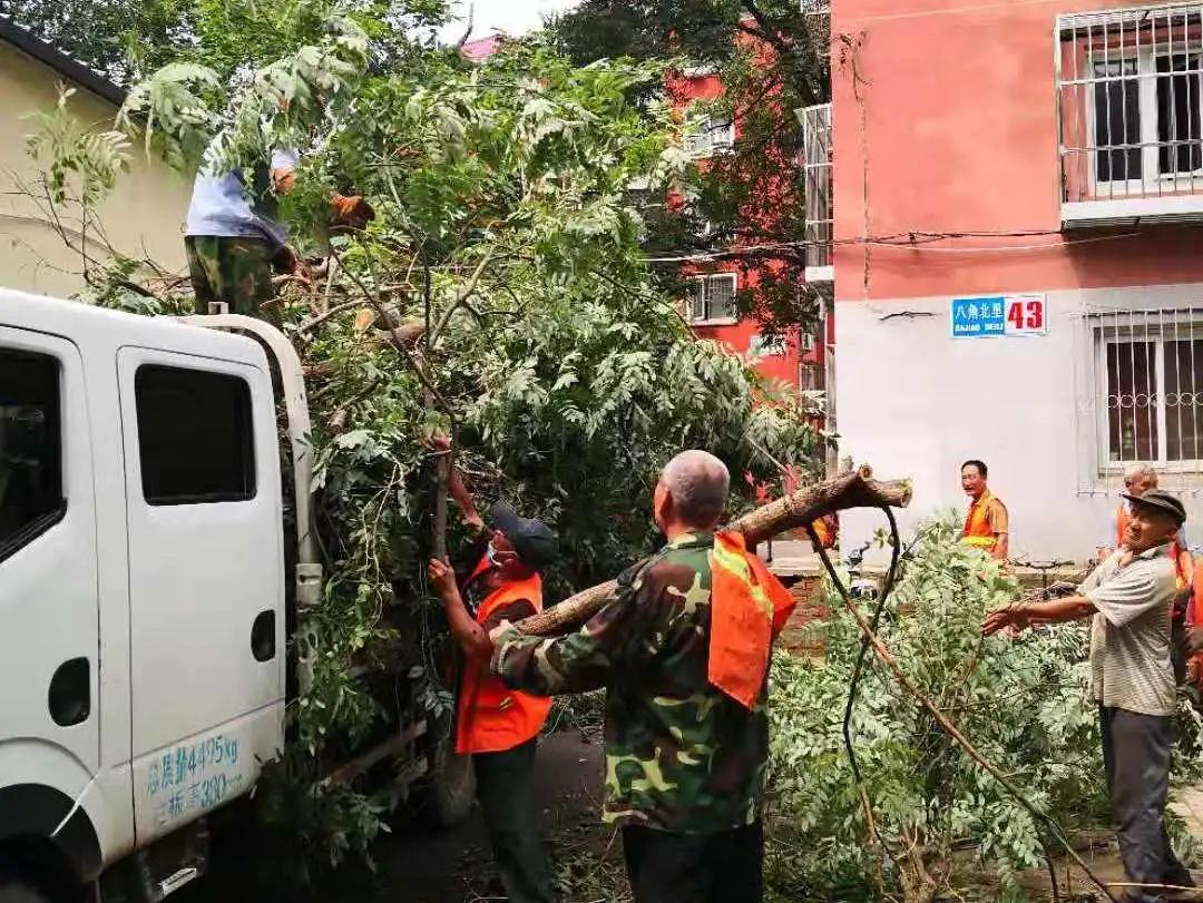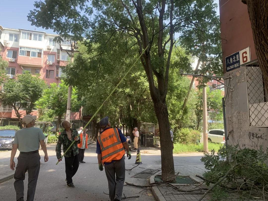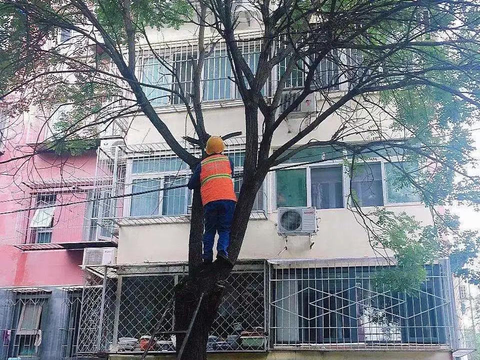 因为属于高空作业,操作起来有一定难度,需寻找专业的工具和人员。八角北里社区主动作为,第一时间联系区园林局,安排专业人员实地勘察、测量,制定树木修剪方案。对用电线路近距离的树木重点修剪,解决了大家“望树兴叹,无从下手”的困扰,使阳光重新照进居民家里。
