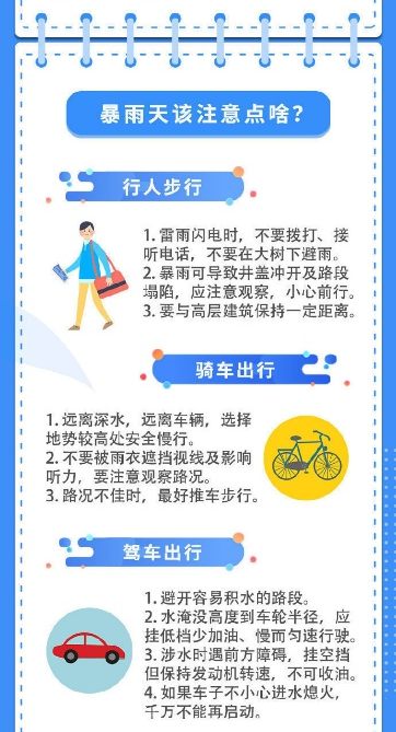 近期各地暴雨天气多发,易导致城市内涝等次生灾害,为公众出行带来安全隐患,暴雨天在外行走要注意些什么?驾车出行又该如何保障安全?