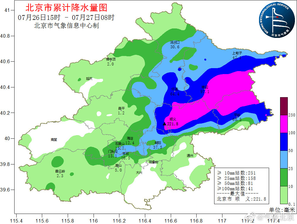 北京市气象台发布26日15时至27日08时降水量(毫米):全市平均24.8,城区平均20.5,东北75.7,西北7.6,西南3.2,东南1.6,城区最大朝阳孙河站77.4,全市最大顺义221.8;07-08时最大降雨出现在密云巨各庄,为48.4毫米;截至08时,顺义、密云、平谷、怀柔共计41个站降雨量超过100毫米。