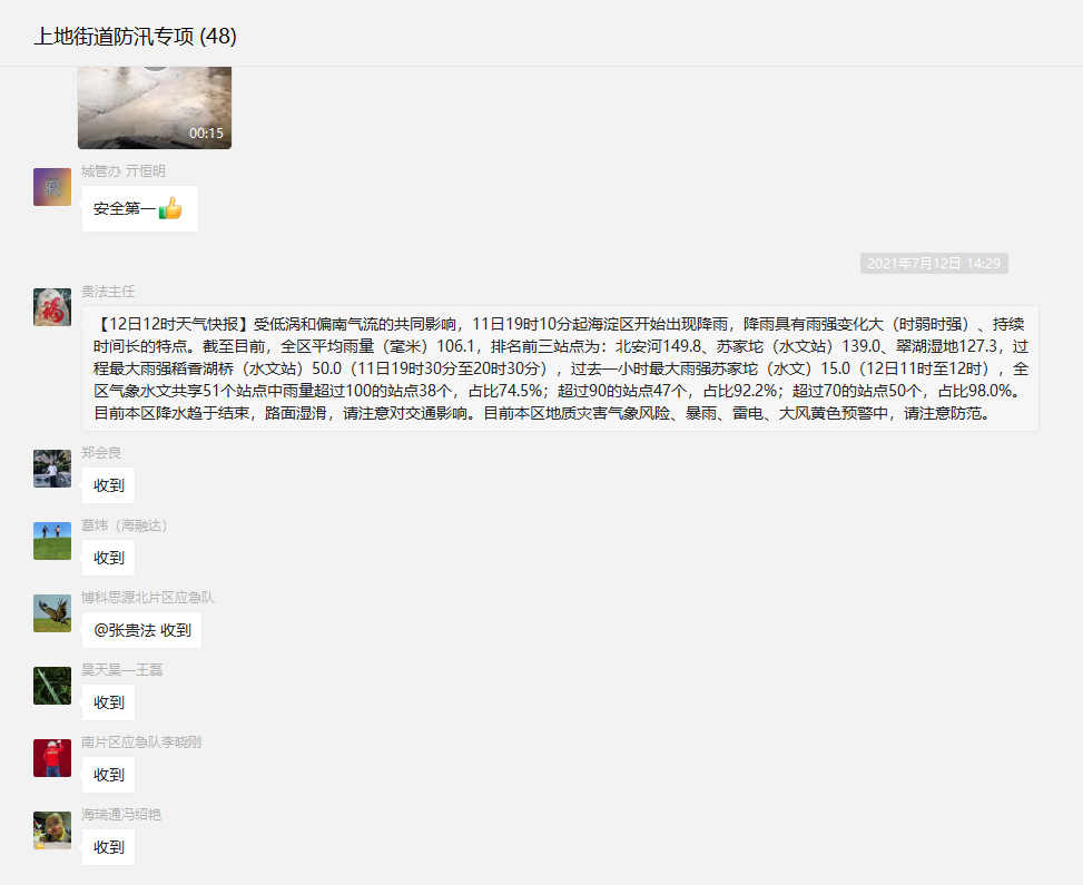 在上地街道有一个防汛专项工作群,群里的分管负责人24小时实时通报着自己片区内的汛情信息。