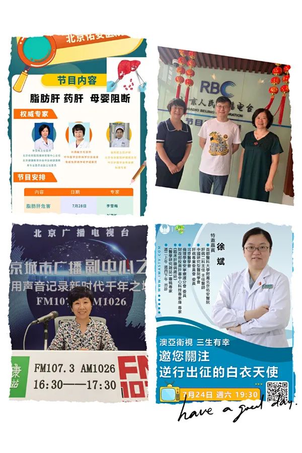 此外,北京佑安医院在世界肝炎日之际,积极开展健康传播,宣传中心、慢病管理中心联合组织多位专家在人民日报、人民网、新华网、北京广播电视台、澳亚卫视、健康报、科技日报、渔歌医疗、医院官方自媒体平台等媒体直播肝病防治科普,传播科学健康知识,服务百姓健康。