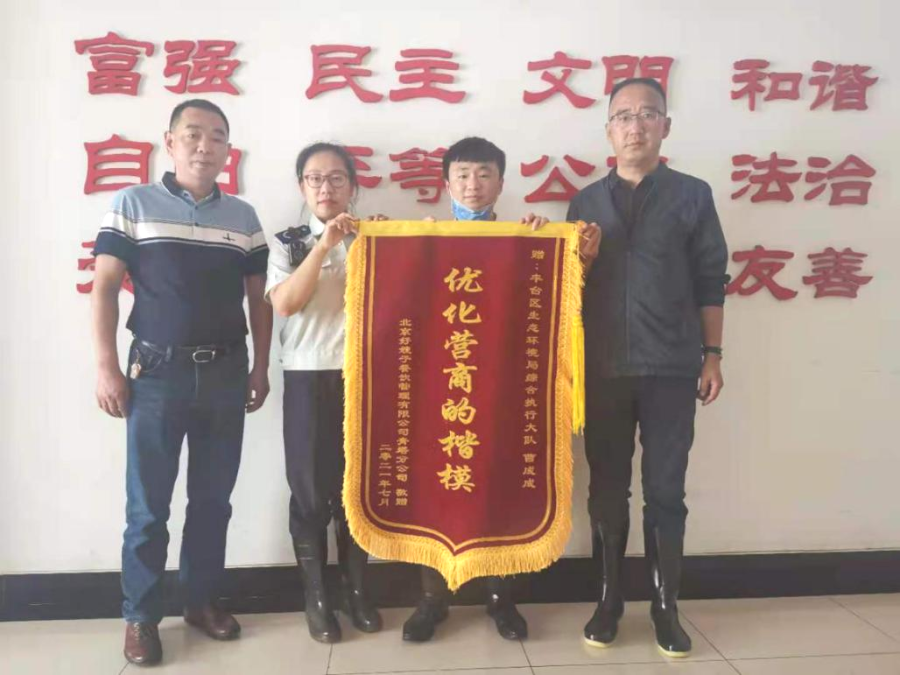 7月12日下午,丰台区生态环境局执法人员收到辖区一家餐饮企业送来的锦旗,锦旗上写着:“优化营商的楷模”。
