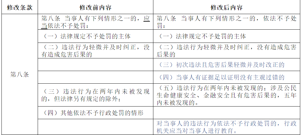 值得一提的是,此次修订后,删去了原标题中的“试行”二字,同时,按照“坚持处罚与教育结合”原则,在“不予处罚”规定中补充——“对当事人的违法行为依法不予行政处罚的,行政机关应当对当事人进行教育。”