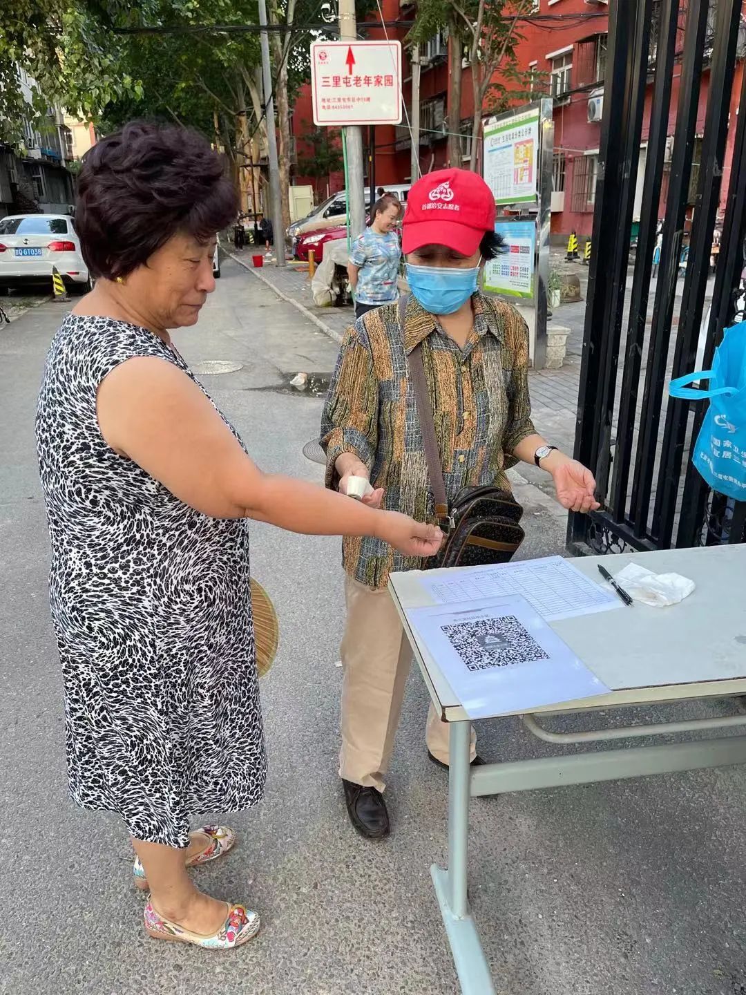 社区疫情防控志愿者上岗,在小区卡口查证、测温、验证健康码。