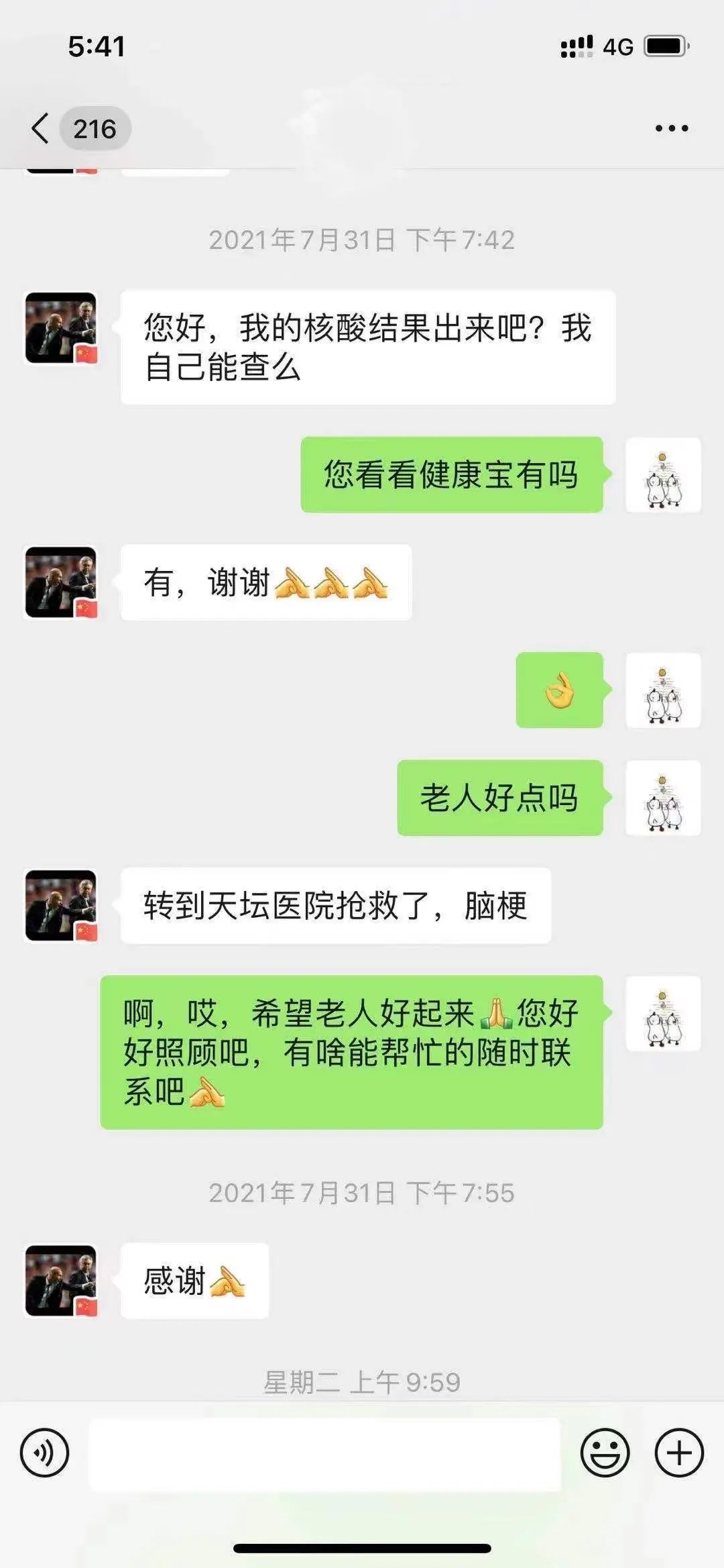 “您放心,我们在呢,交给我们,咱们保持联系!”北太平庄街道文慧园社区工作人员李絮柳了解情况后,用这简单的17个字回复了徐先生,并第一时间与社区杨瑾书记沟通,上报街道防疫部门核准。随后在社区工作人员的陪伴下,120救护车将老人送往医院发热门诊。