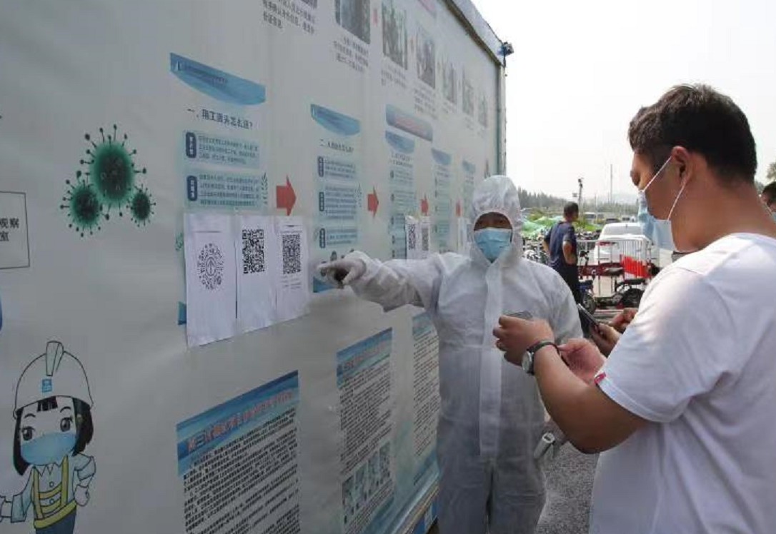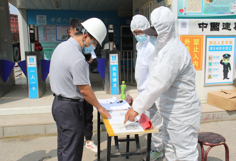 在“南三村”棚户区改造回迁安置房项目建设工地现场,建筑工地工作人员身穿隔离服,手持测温枪正在为进入施工现场的工人测量体温,身边摆放免洗消毒洗手液和口罩等防疫物资。检查人员仔细询问了进门的防疫步骤,并到生活区查看了进门处的健康宝二维码和行程码,检查了消杀记录和物资储备情况。现场,工作人员叮嘱施工单位要做好中高风险地区人员排查工作。