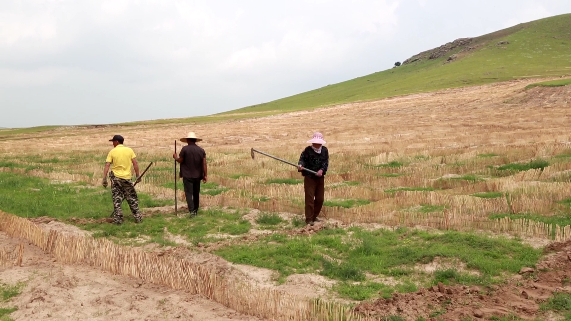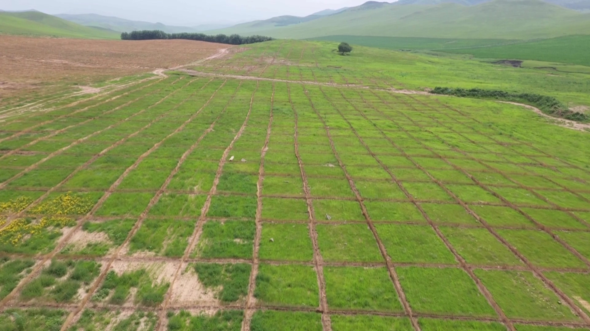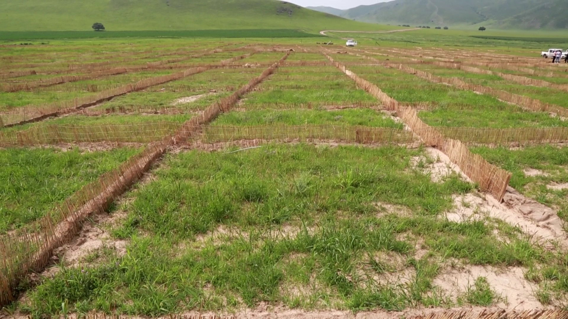 驱车穿行于科右前旗桃合木苏木阿其郎图嘎查,随处看到美丽的村庄与起伏的山丘皆被绿色覆盖。来到阿其郎图嘎查大茫哈和小茫哈,方格网芦苇沙帐进入眼帘,人工撒播多年生和一年生的草已经长了出来,空气中散发着青草的香气。很难想象,从前因地质和干旱的原因沙化严重的草地,如今已经被大片大片的绿色植被覆盖。