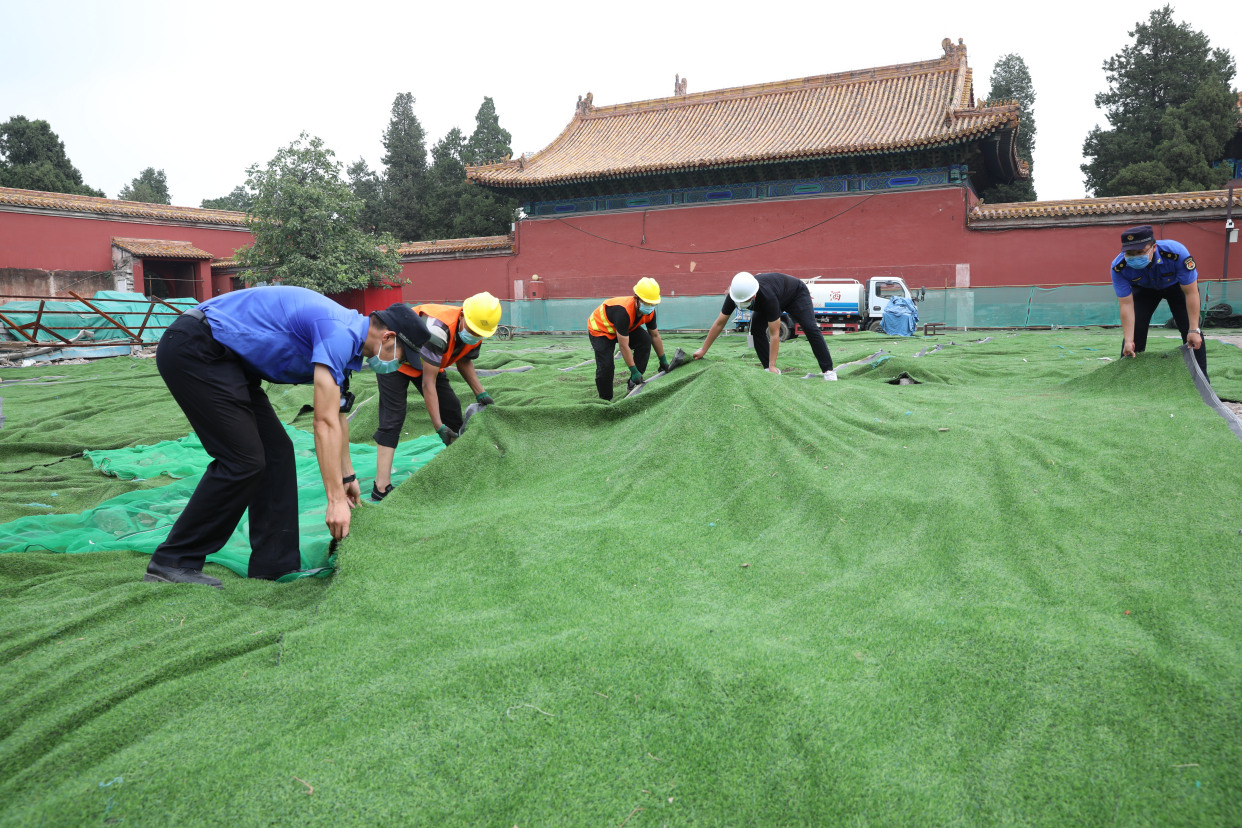 在现场,记者看到工人们将仿真草皮逐一铺在拆除后的场地上,“这些都是建筑垃圾,灰尘较多,为了防止后面刮风形成扬尘,在拆除过程中一是要求洒水降尘,二是要求施工方随拆随盖,保证绿色施工”,执法队员侯啸尘告诉记者。