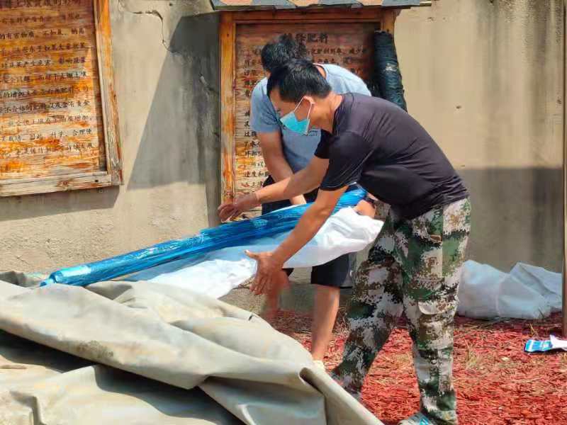 8月9日,在兴寿镇鑫城缘果品专业合作社内,种植户将自家的废旧农用地膜收集起来,经过工作人员检查登记后,统一运送至固定的废旧地膜存放处。根据每家种植户废旧地膜的回收数量,工作人员按照新旧比1:2的比例,(即2kg旧膜兑换1kg新膜)为其兑换新地膜。
