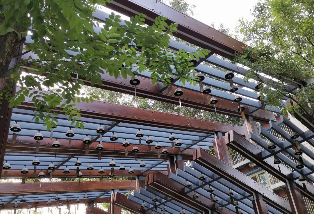 廊架上布满了铜制的驼铃灯,中间有铜板垂吊下来,像是一盏盏铃铛开门迎客。据悉,人行步道两侧,还将装上能够响铃的驼铃灯,轻轻摇晃或是微风拂过,就能听到清脆的声声驼铃。