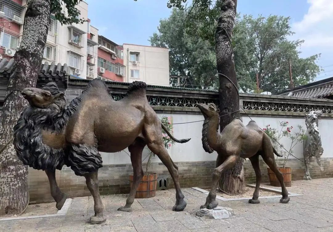 在东入口的路北侧,一组铜制骆驼雕塑也已经亮相,两只骆驼一大一小、一老一少、体态健硕、步伐矫健、面部朝西、组队前进。