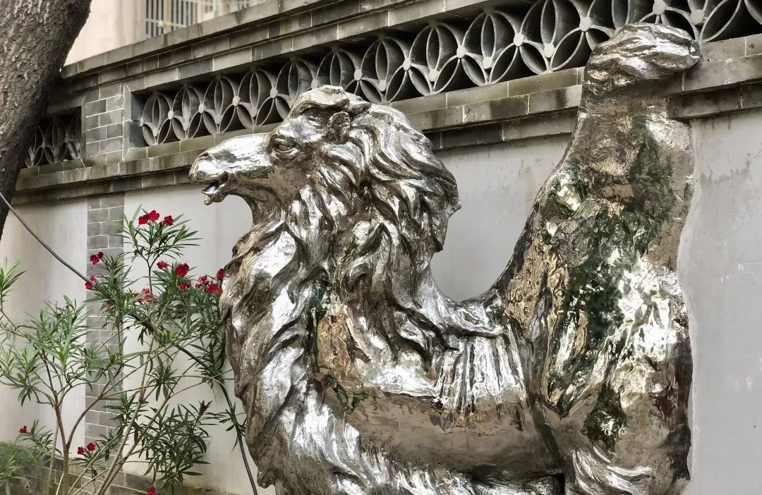 一旁的白墙上,还有一只银色骆驼从墙内探出半个身子,意为驼队迤逦,接续向前,未来这里还将结合影像投影,营造一支完整的驼队,虚实相接,仿佛从古穿越至今。