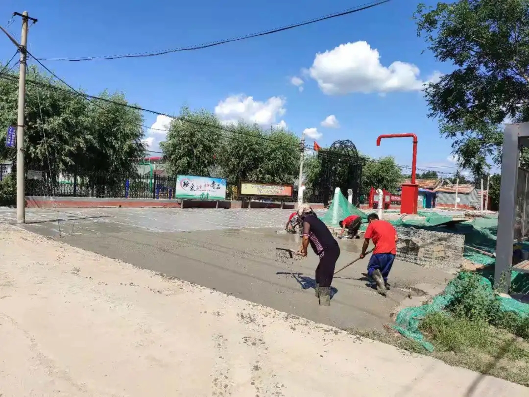 ▲工作人员铺设消防水池周围水泥路面