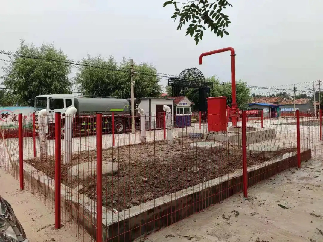 在确定施工地点后,工作人员对现场进行测量定位、清理障碍物,并在消防水池的四周安装防护围栏。工作人员还将围栏粉刷成红色,增加取水点的辨识度,让村民能在发生火灾时快速找到消防水池进行取水。