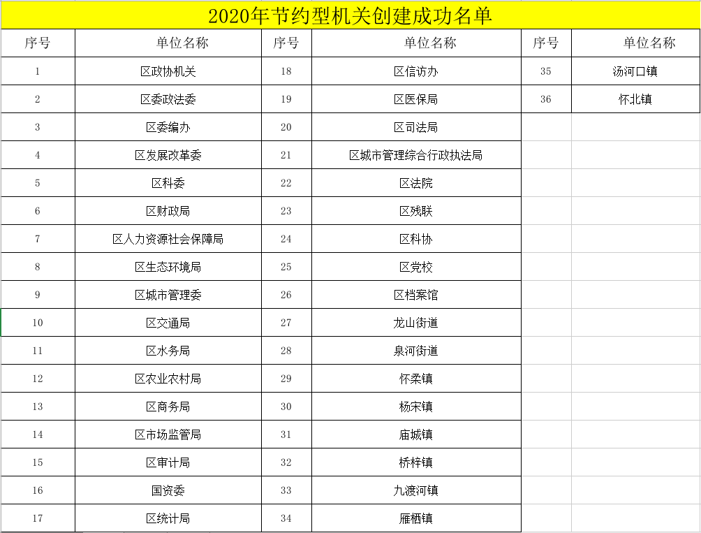 2020年8月启动怀柔区节约型机关创建工作,按照整体推进、分期达标的方式和流程开展工作,明确到2020年底20%以上的区级党政机关达到创建要求;到2021年底70%以上的区级党政机关达到创建要求;到2022年底75%以上的区级党政机关达到创建要求。2020年底全区共有36家处级及以上党政机关被确定为节约型机关,达标率达到47%,超额完成了年度目标。