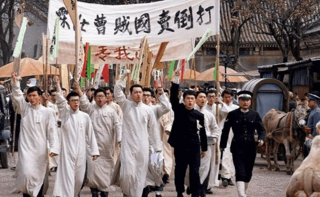 ▲5月4日下午,北京大学等13所学校3000多名学生,冲破军警的阻挠到天安门前集会演讲、游行示威,提出“外争主权,内除国贼”、“取消二十一条”“拒绝签字”等口号。(图为电视剧《觉醒年代》剧照)