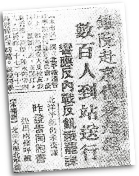 1935年12月9日,面对日本侵略者的嚣张气焰和无理要求,偌大华北,安放不下一张平静书桌,国家危急存亡之际,千余学生举行抗日请愿游行,我校学生会也紧急成立“非常委员会”,于12月16日组织学生与清华大学、燕京大学等高校一同参加大规模示威游行。