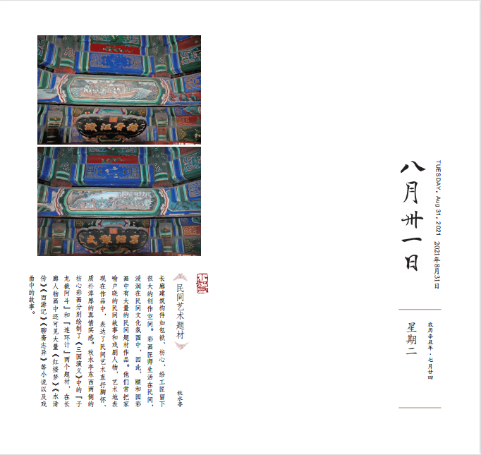 长廊建筑构件如包袱、枋心,给工匠留下很大的创作空间。彩画匠师生活在民间,浸润在民间文化氛围中,因此,颐和园彩画中有大量的民间题材作品。他们常把家喻户晓的民间故事和戏曲人物,艺术地表现在作品中,表达了民间艺术直抒胸怀、质朴淳厚的真情实感。秋水亭东西两侧的枋心彩画分别绘制了《三国演义》中的“子龙截阿斗”和“连环计”两个题材,在长廊人物画中还可见大量《红楼梦》《水浒传》《西游记》《聊斋志异》等小说以及戏曲中的故事。